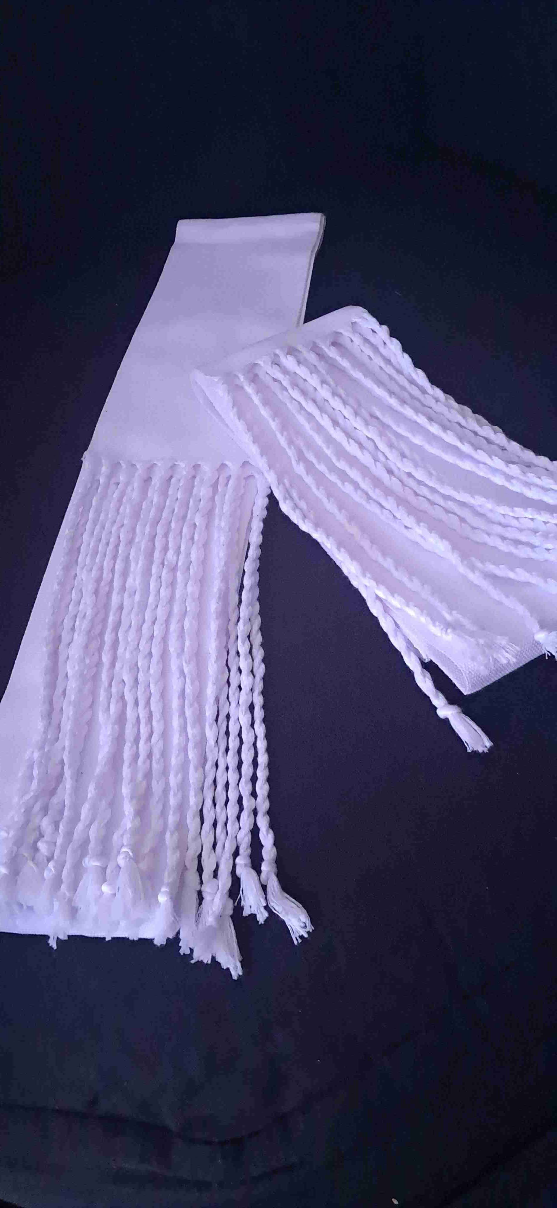 Faja adulto color blanco con flecos trenzados, medidas 2.60 mt de largo x 12 cm de ancho, material hilo excelente calidad.