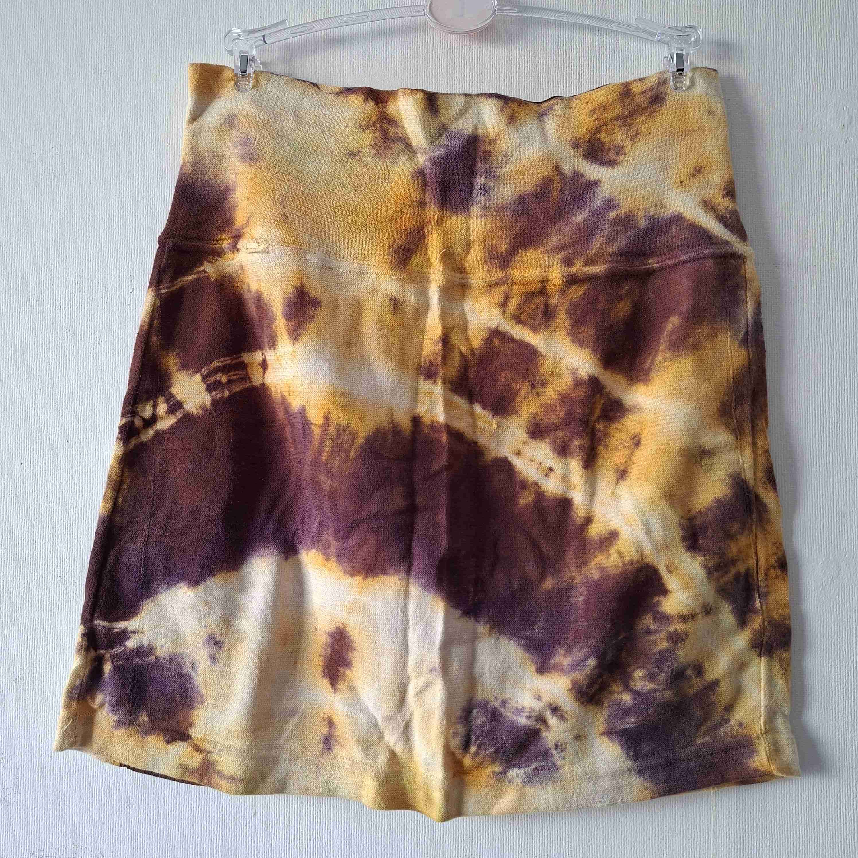 Falda corta con diseño tie-dye en tonos amarillos y marrones. Perfecta para un look veraniego y casual.