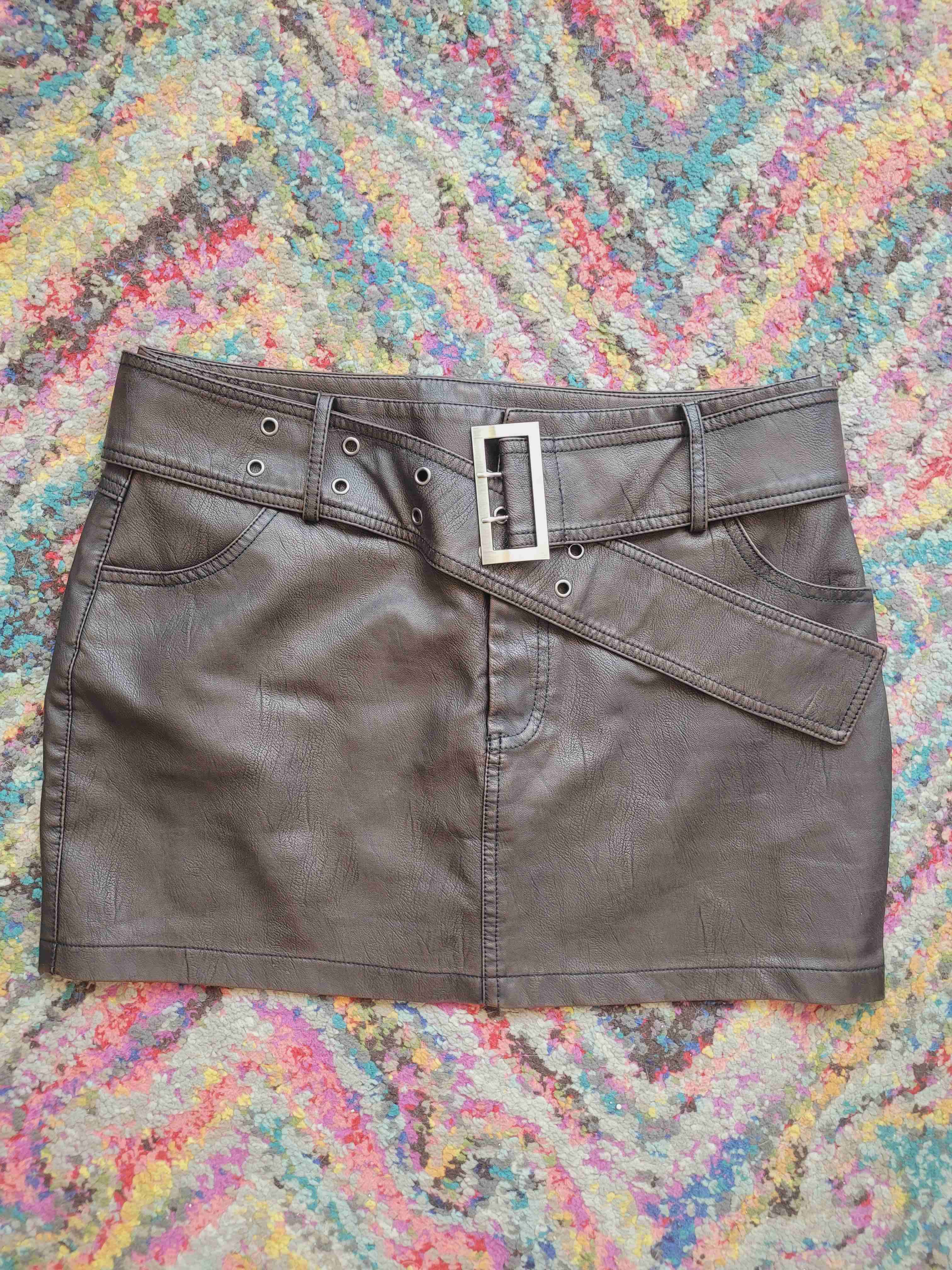 Falda corta de cuero sintético en color cafe con cinturón decorativo. Ideal para ocasiones casuales.
