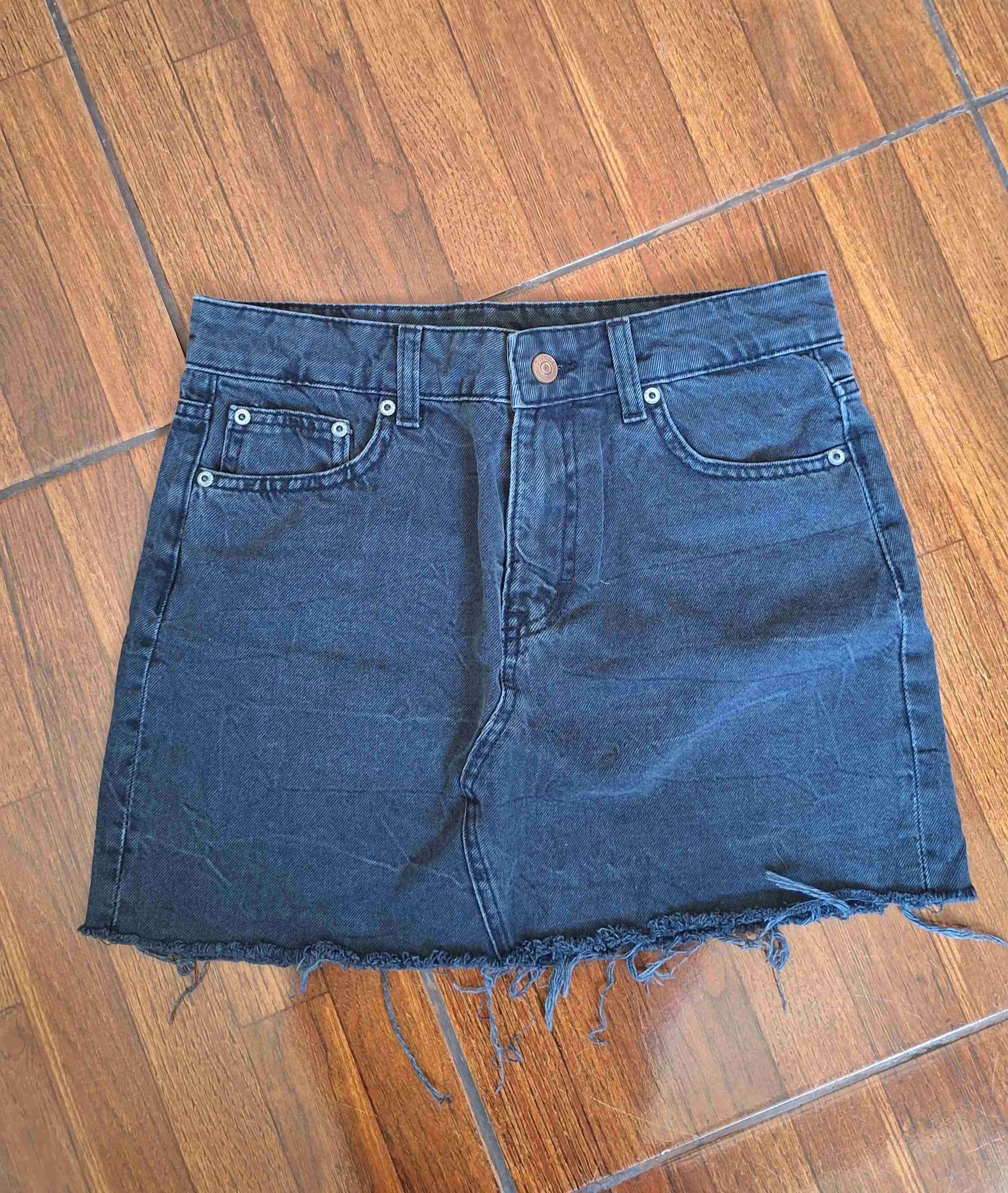 Falda corta de mezclilla negra con borde desgastado, ideal para un look casual. En excelente estado general.