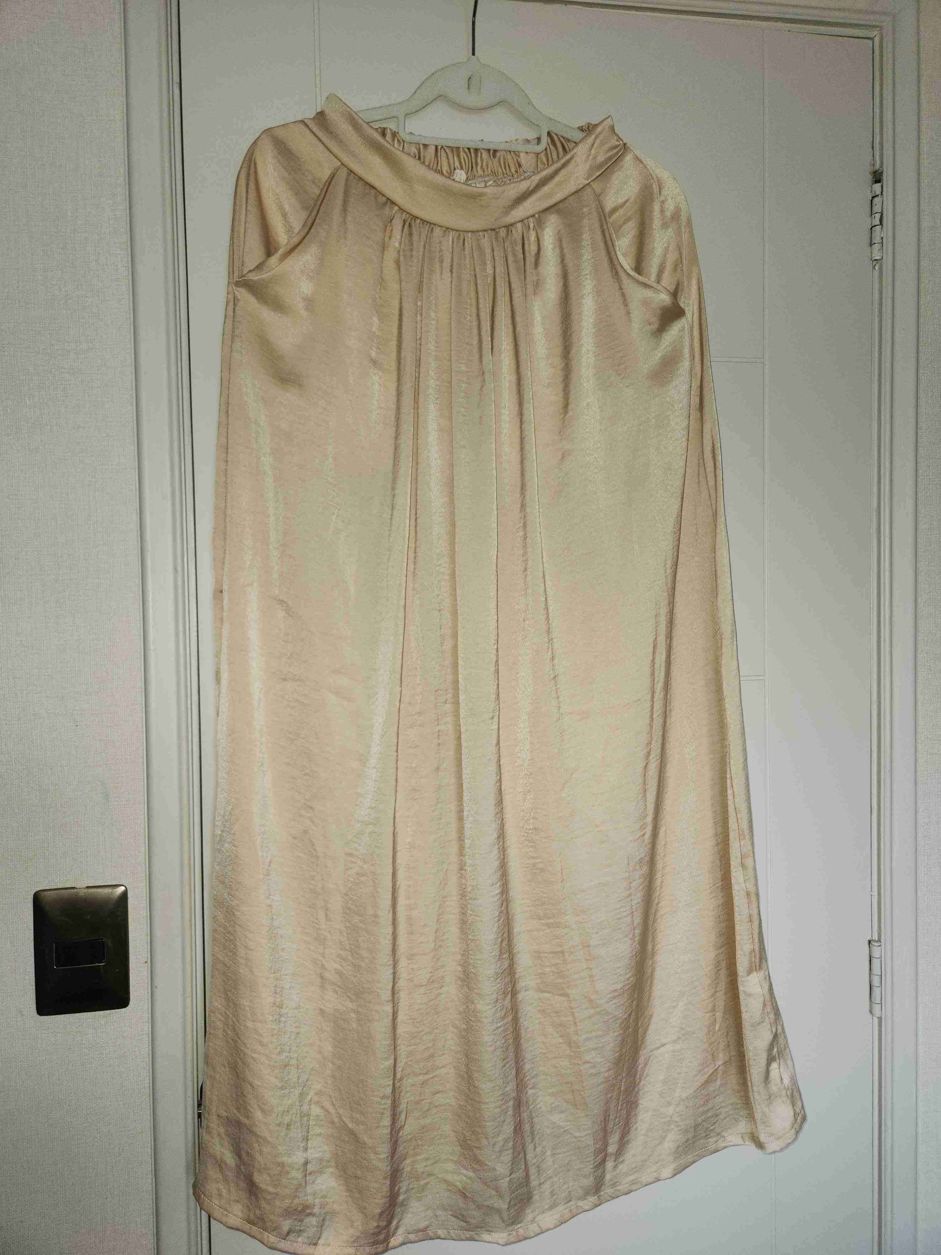 Falda larga con bolsillos en color dorado, con acabado satinado perfecto para ocasiones formales. En buen estado, ideal para eventos especiales.
