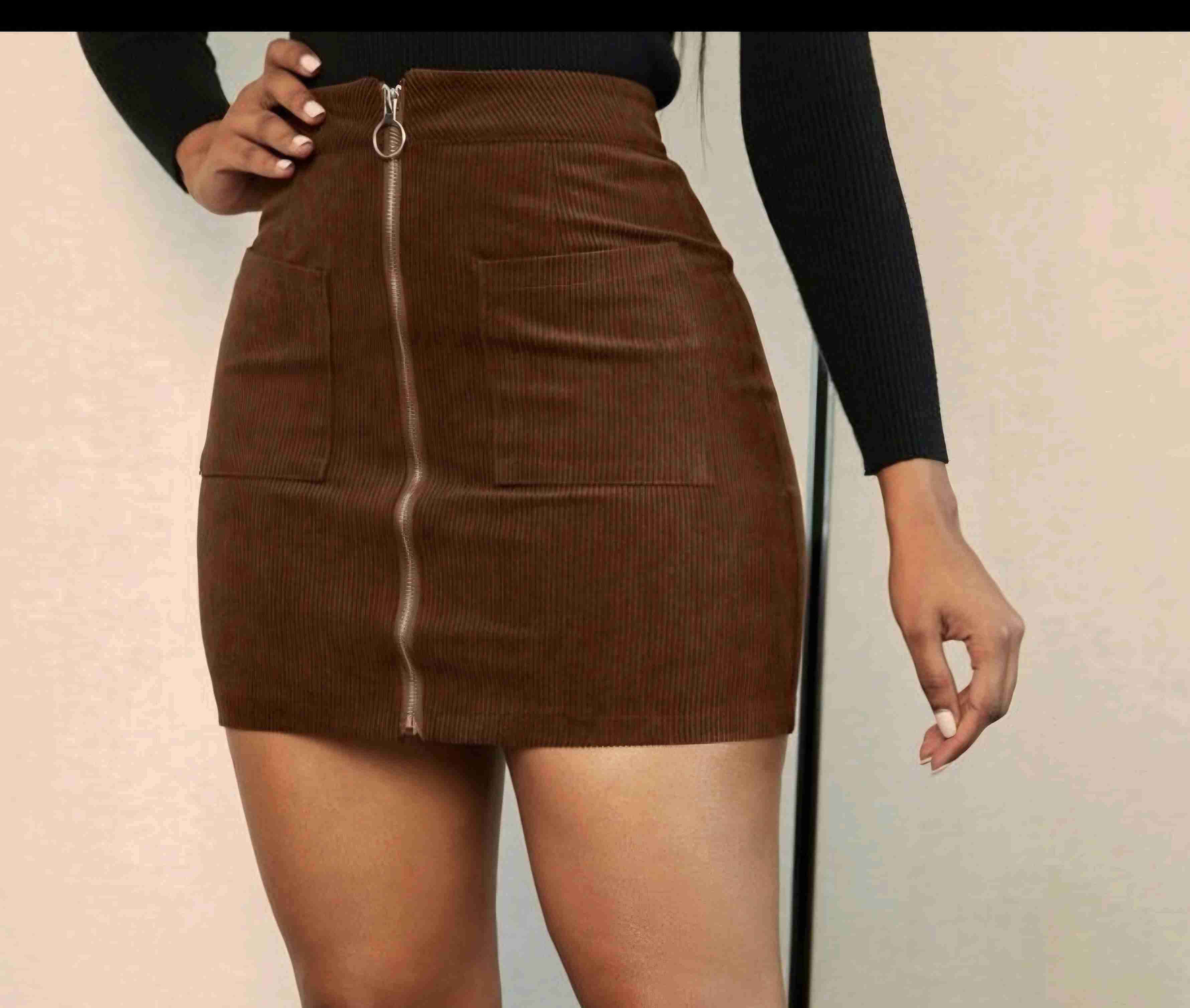 Falda corta de pana marrón con cremallera delantera. Ideal para un look casual. Talla S.