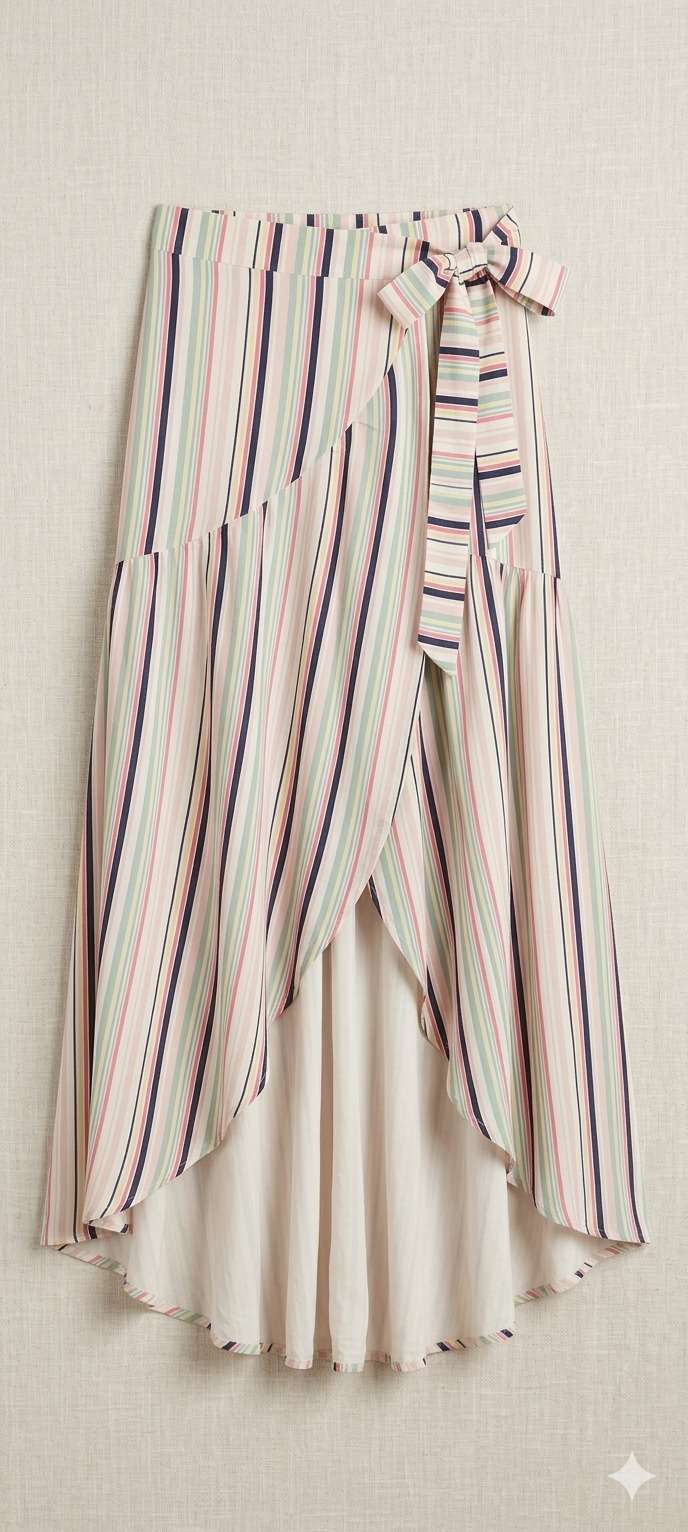 Falda midi con diseño rayado en tonos suaves, detalle de lazo en la cintura. Perfecta para un look veraniego.