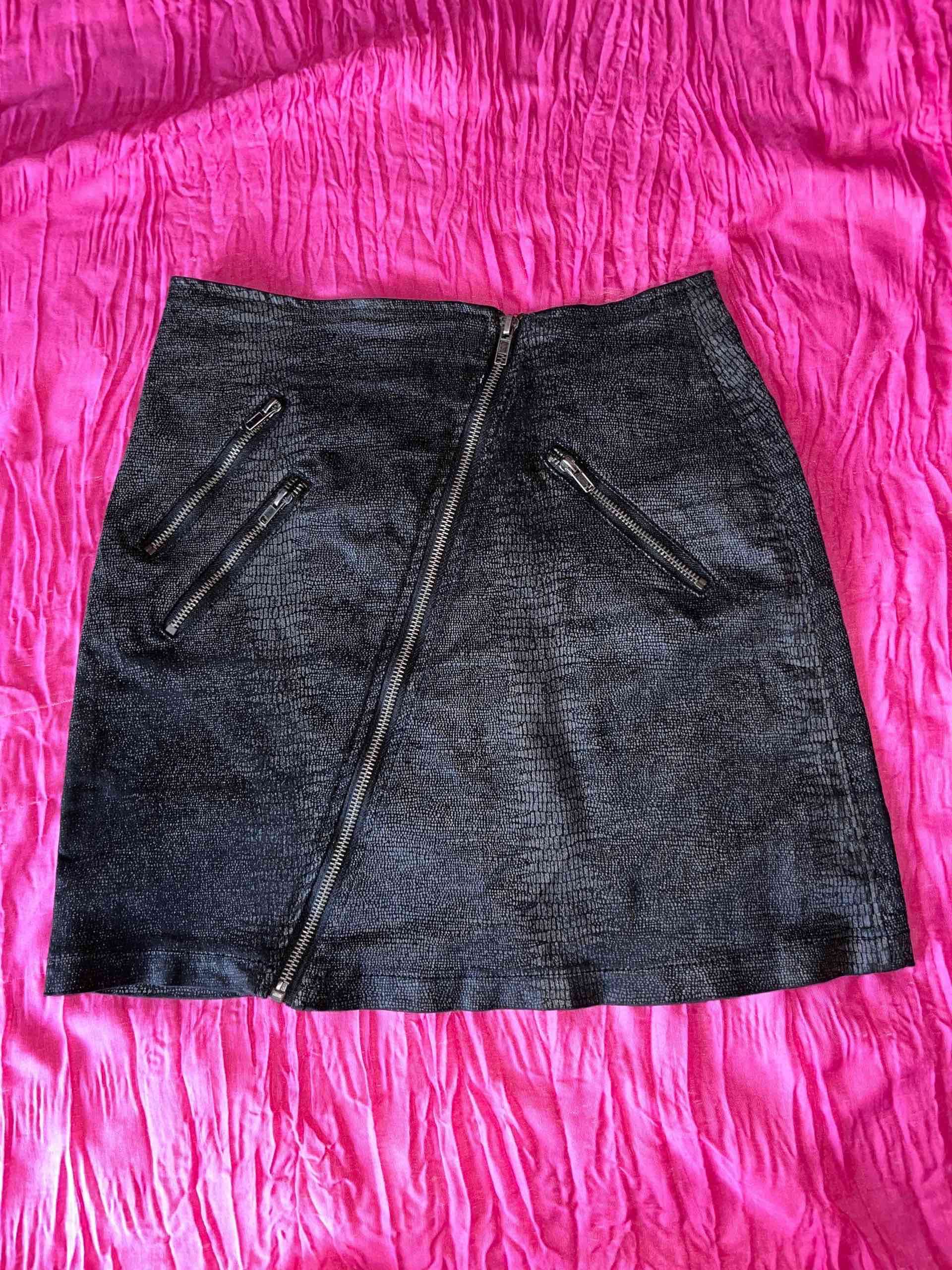 Falda corta negra con detalles de cierres, ideal para un look moderno y urbano. En buen estado.