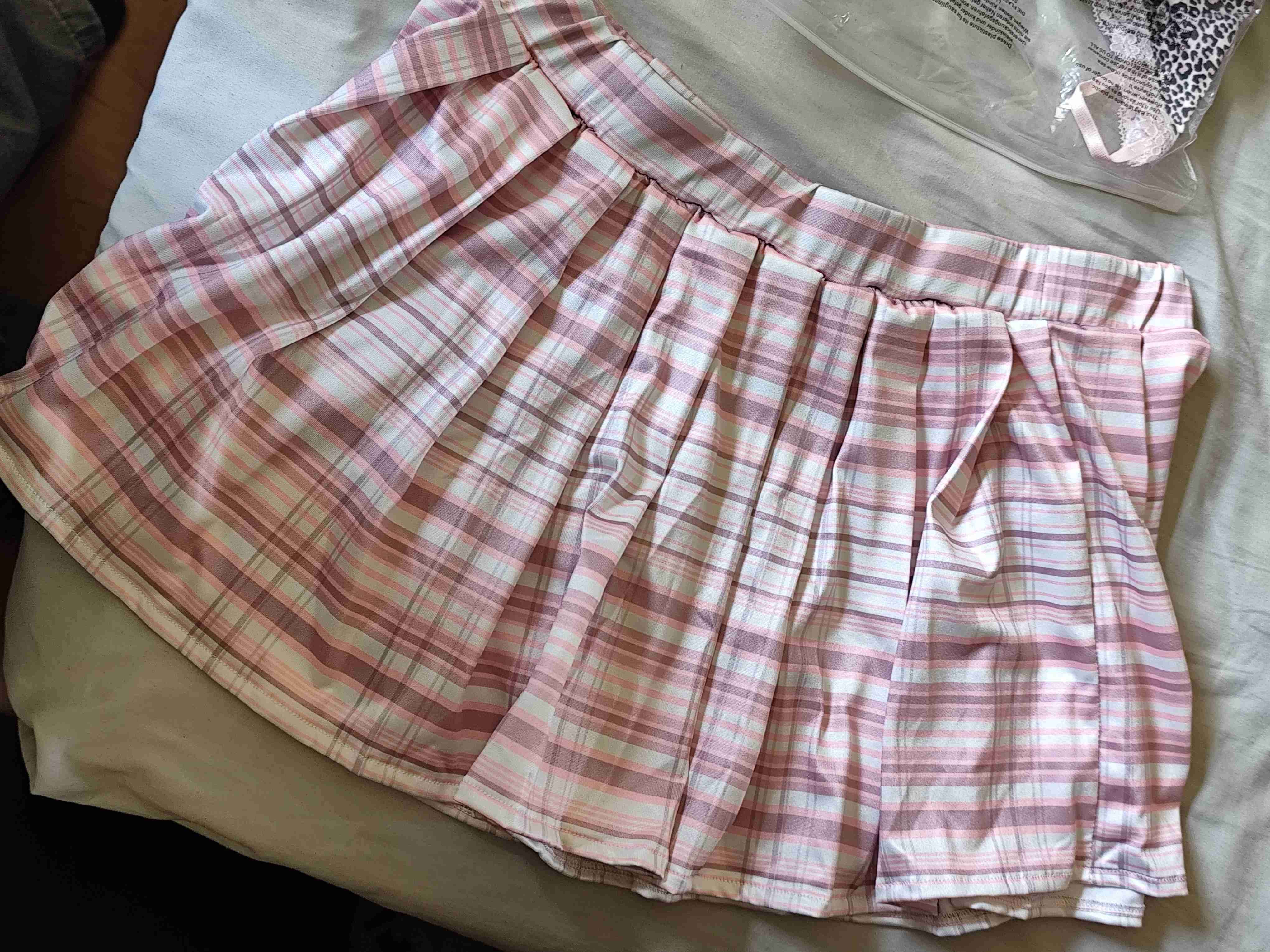 Falda corta con diseño a cuadros en tonos rosados. Ideal para un look casual o primaveral.