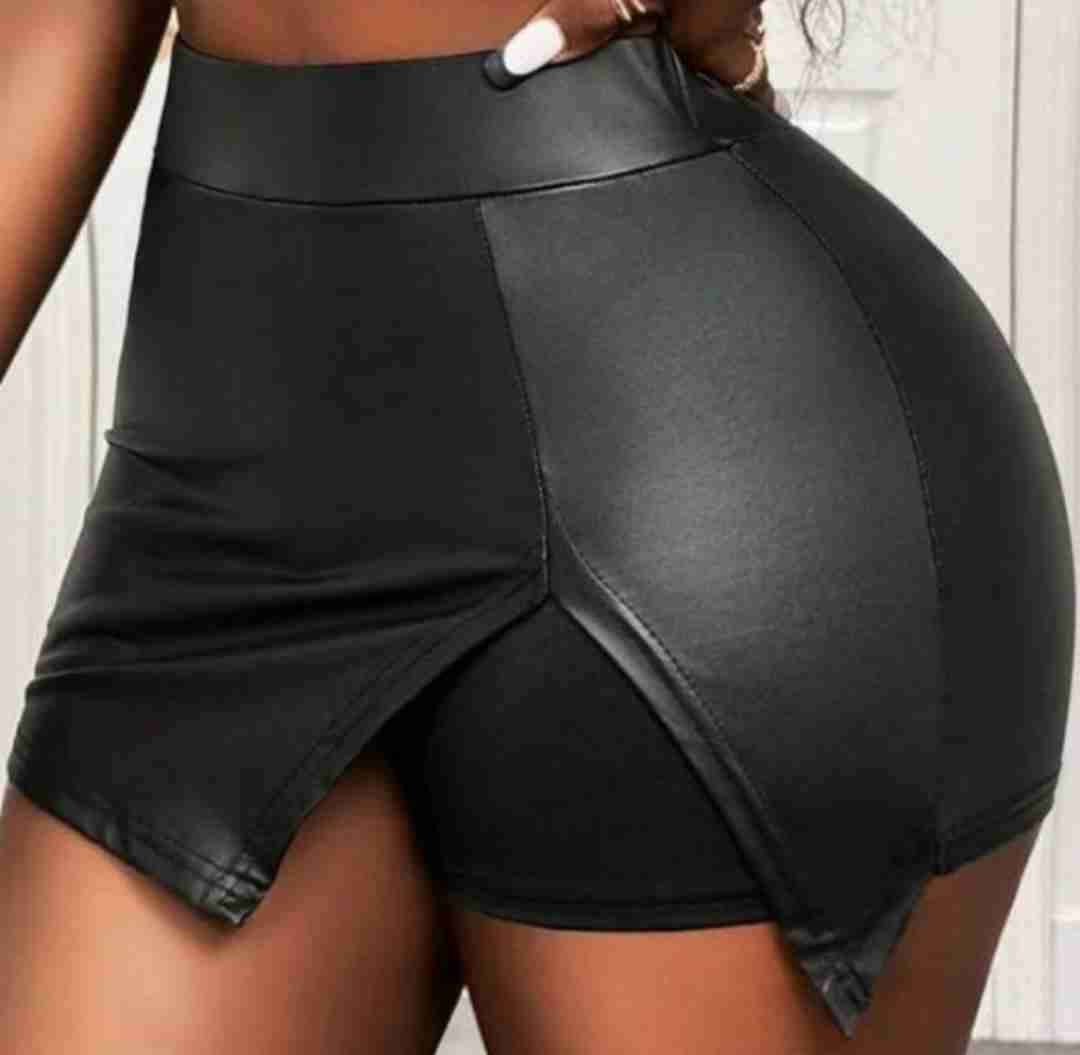Falda shorts ajustados de cuero sintético negro, perfectos para salir de noche. Talla M