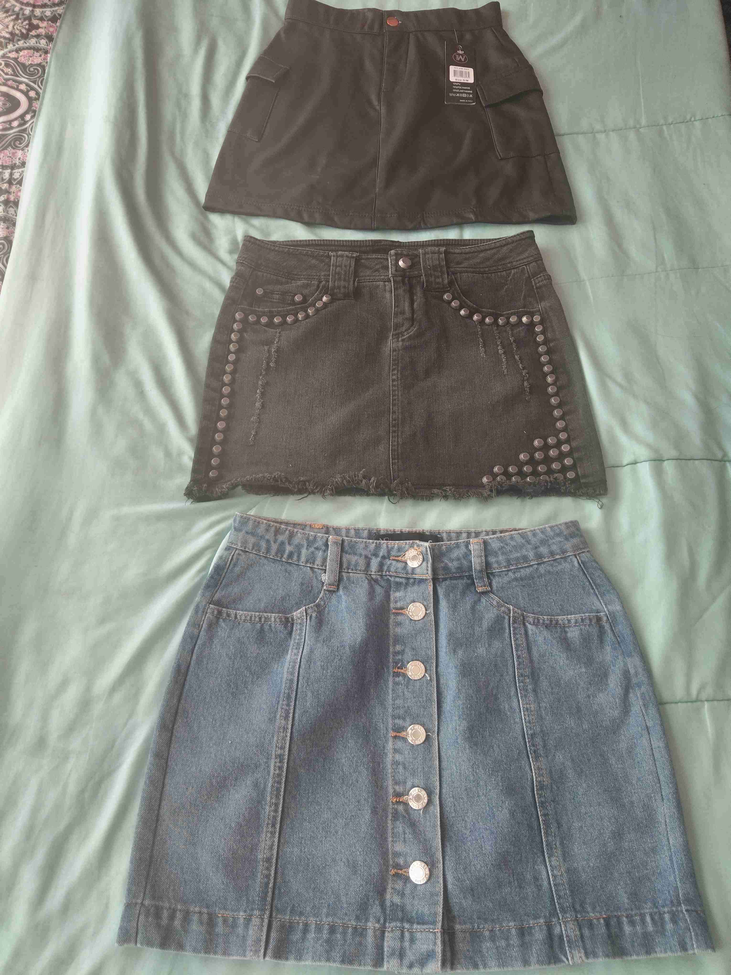 Conjunto de faldas cortas, en denim y negro, estilo casual perfecto para cualquier ocasión.