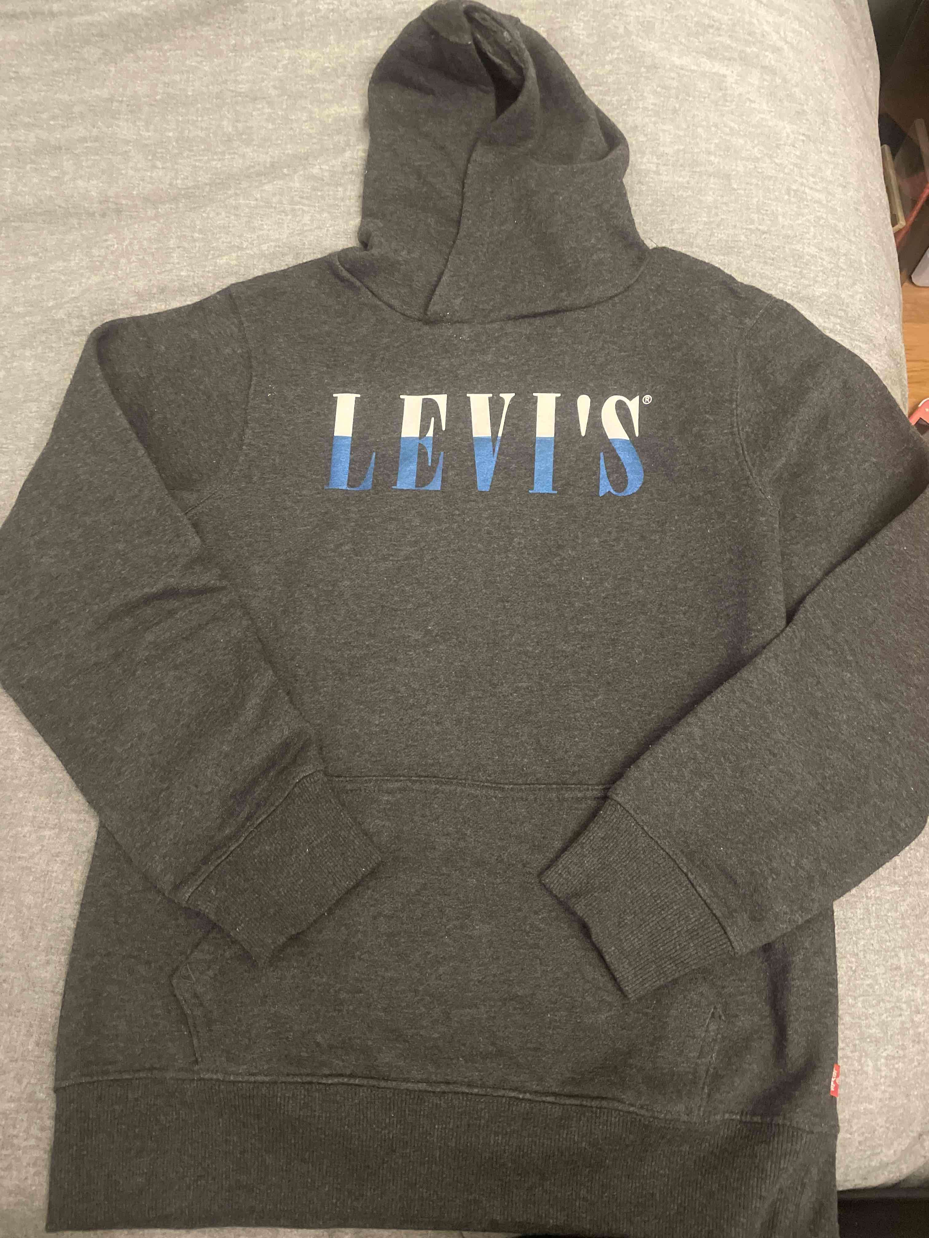 Polerón gris oscuro con capucha y logo Levi's en azul. En muy estado general. Talla L niña