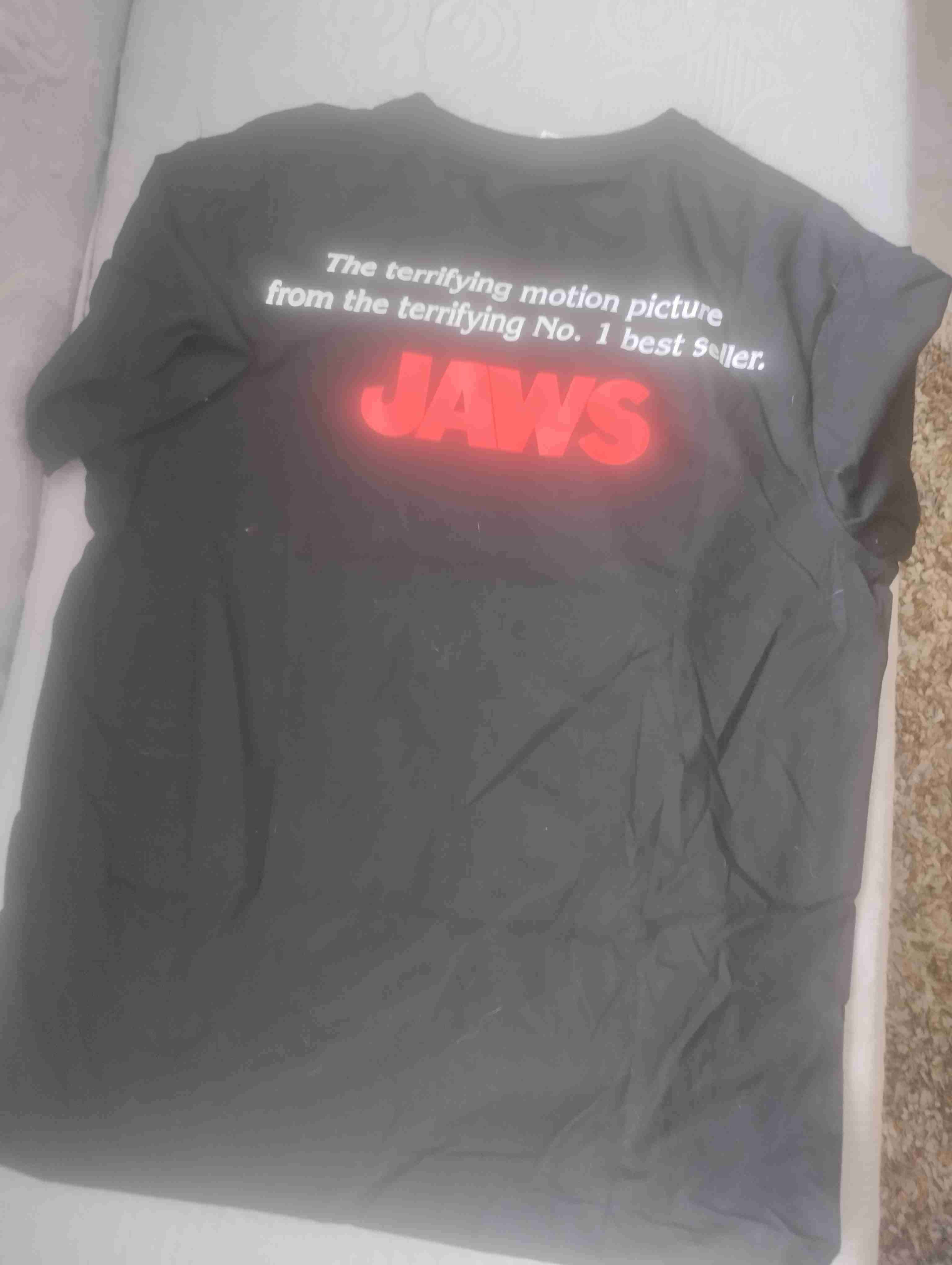 Polera negra con logo de Jaws, estilo casual y cómodo. Ideal para fanáticos del cine clásico.