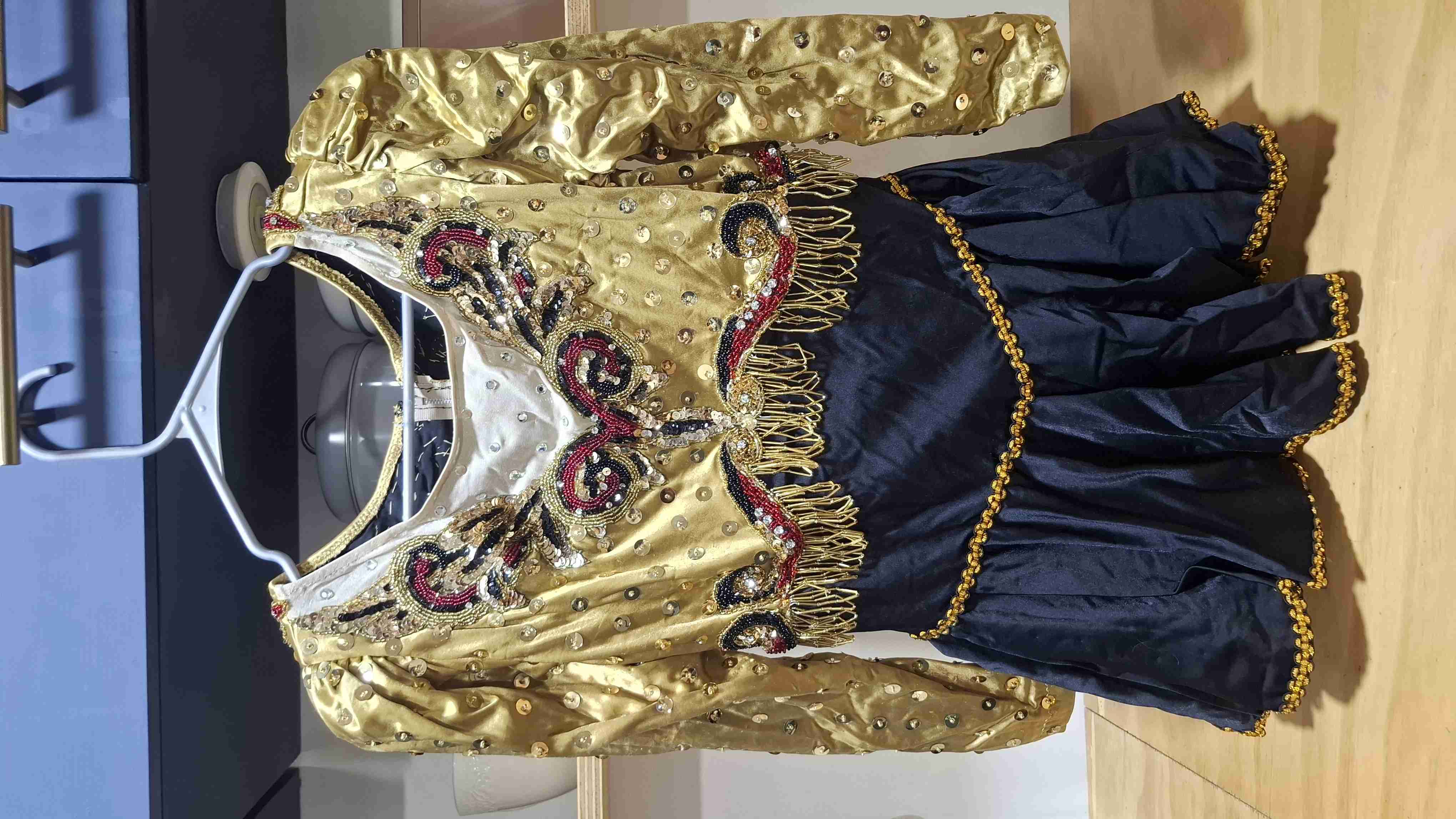 Elegante vestido de danza dorado con detalles en lentejuelas. Ideal para presentaciones artísticas. En buen estado. Talla s Esta tomado igual puede seder una talla mas Es como traje caporal