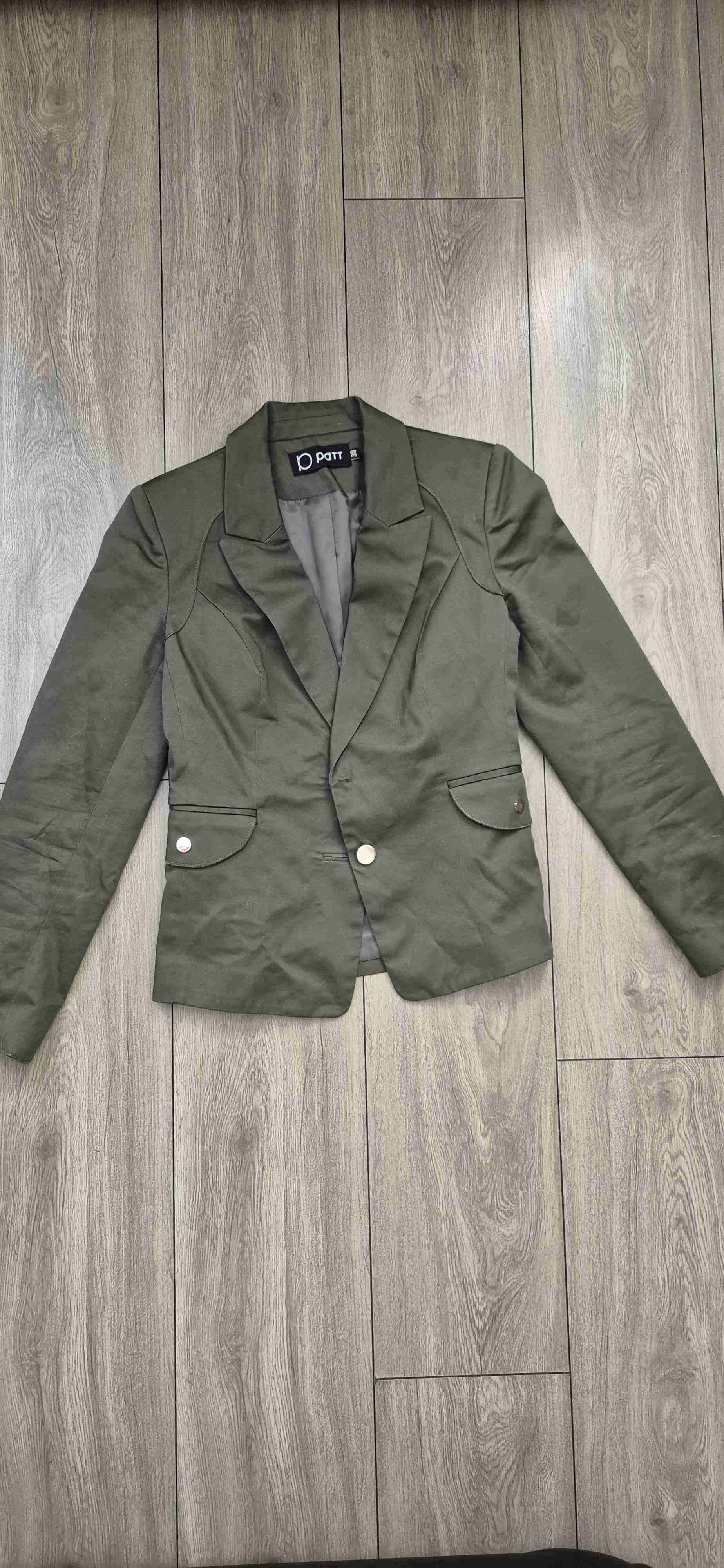 Blazer elegante en color verde oliva, estilo formal ideal para ocasiones especiales. Está en buen estado general.