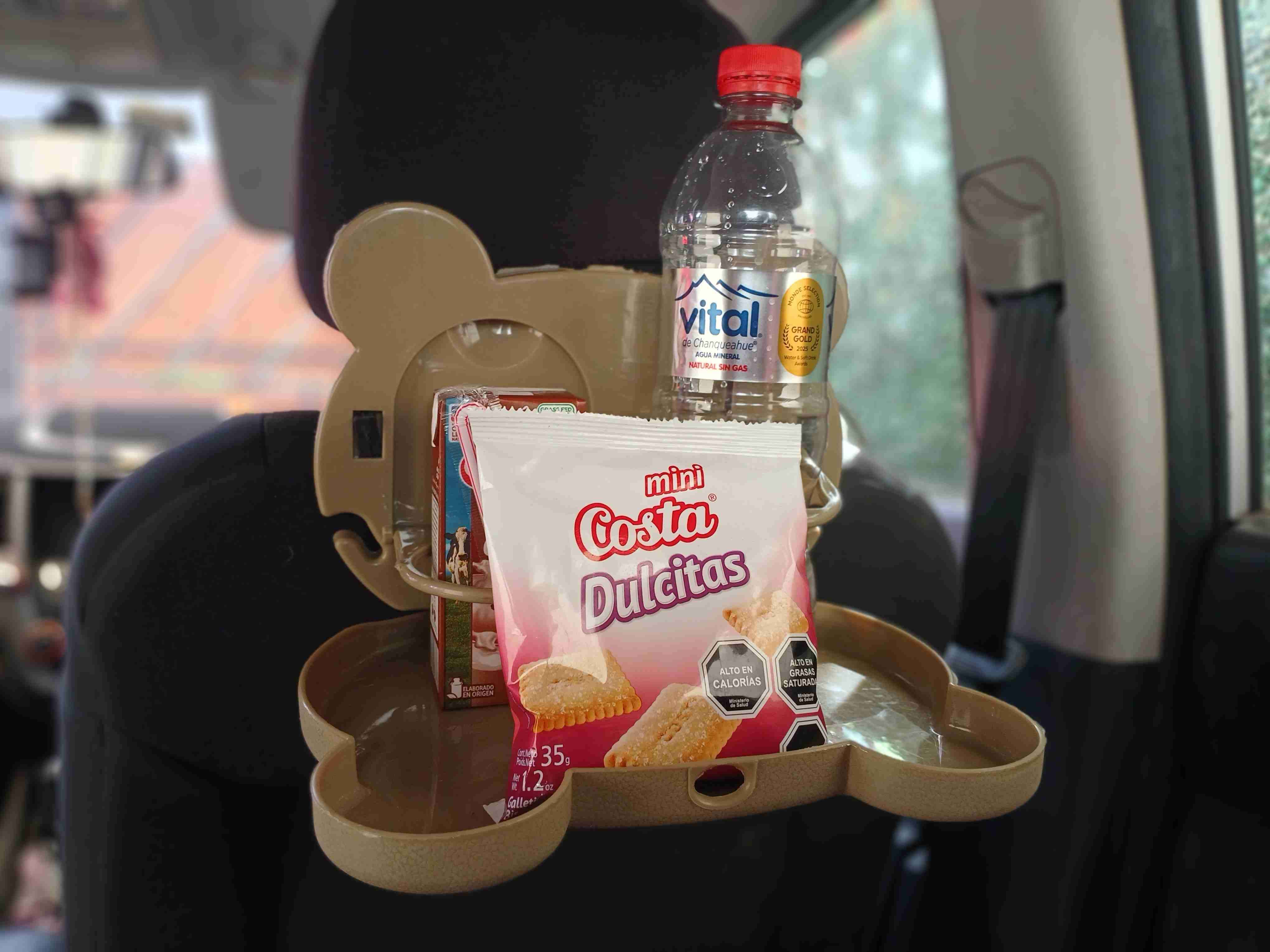 Práctica mesa plegable para el respaldo de asiento de auto. En buen estado, ideal para bebidas y snacks durante el viaje.