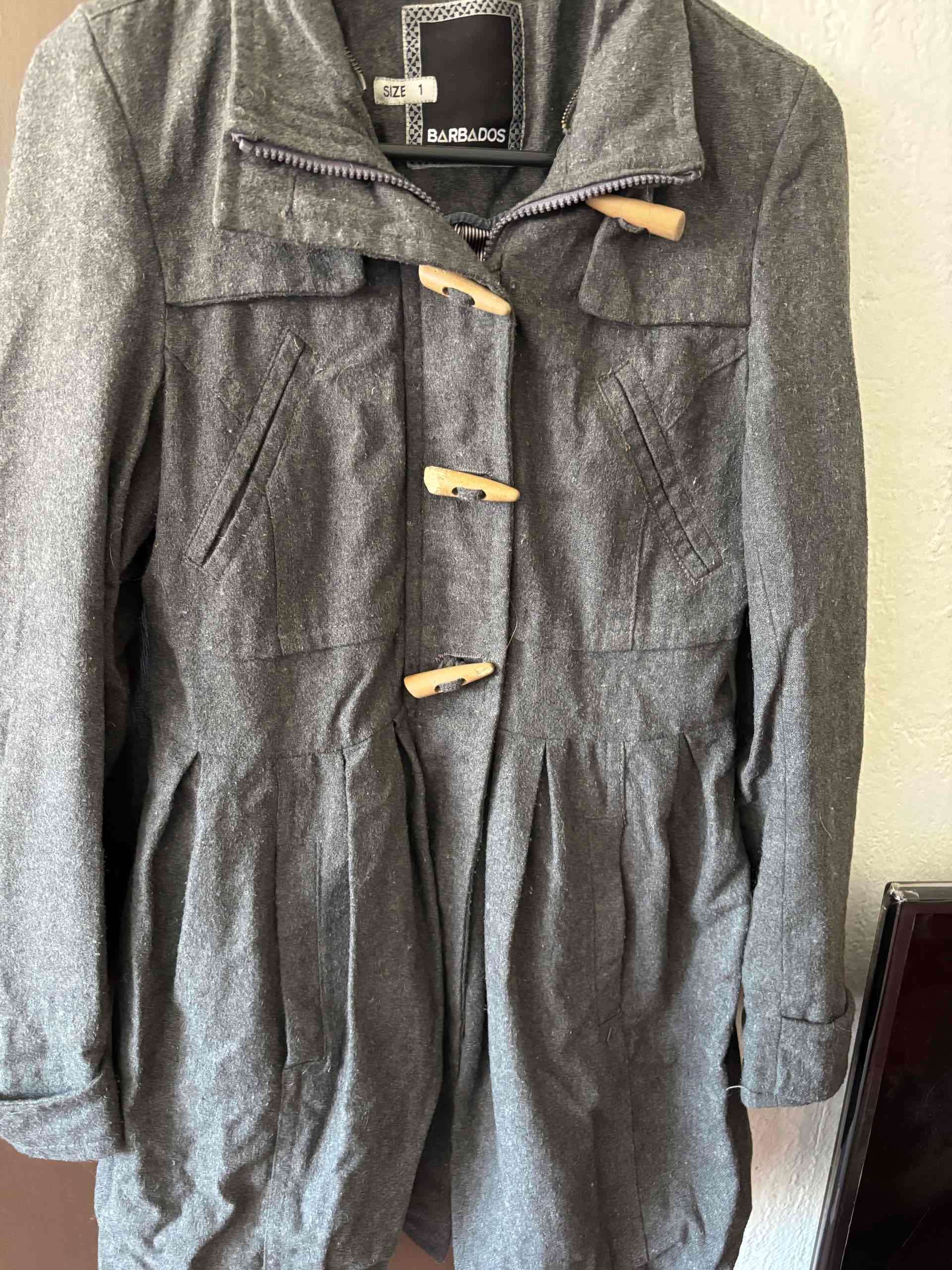 Elegante abrigo gris para días frescos. Buen estado, con detalles de madera en el cierre. Ideal para salidas casuales.