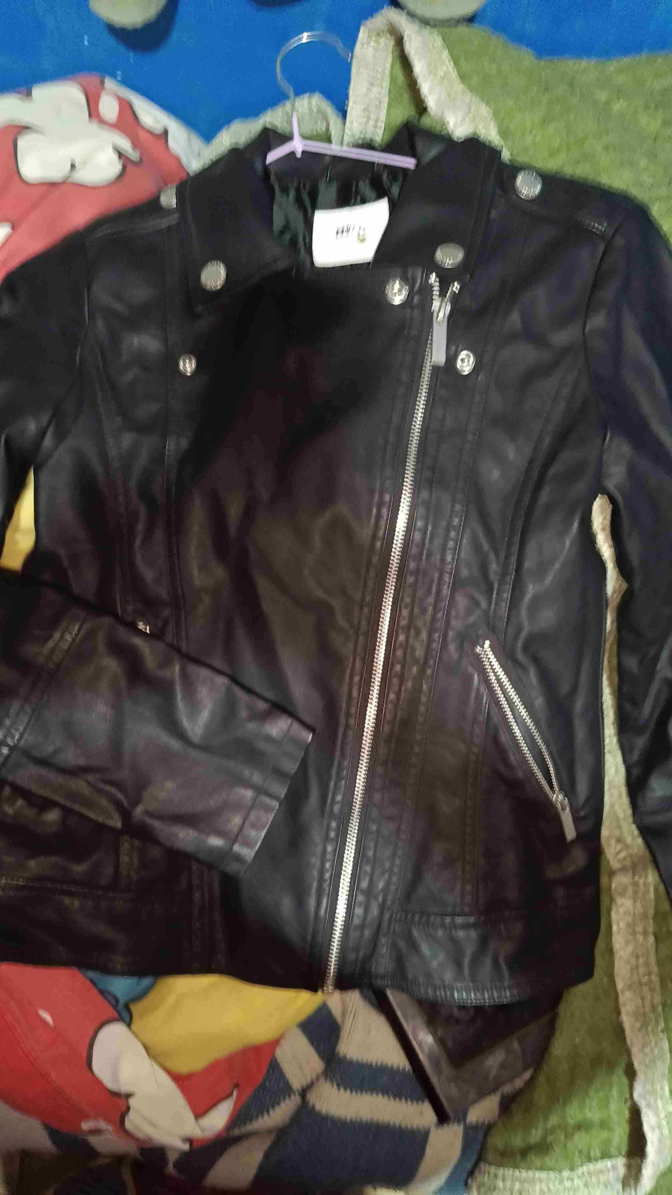 Chaqueta estilo motociclista de cuero negra, perfecta para un look casual. En buen estado con cremalleras visibles. Talla 12 marca elv
