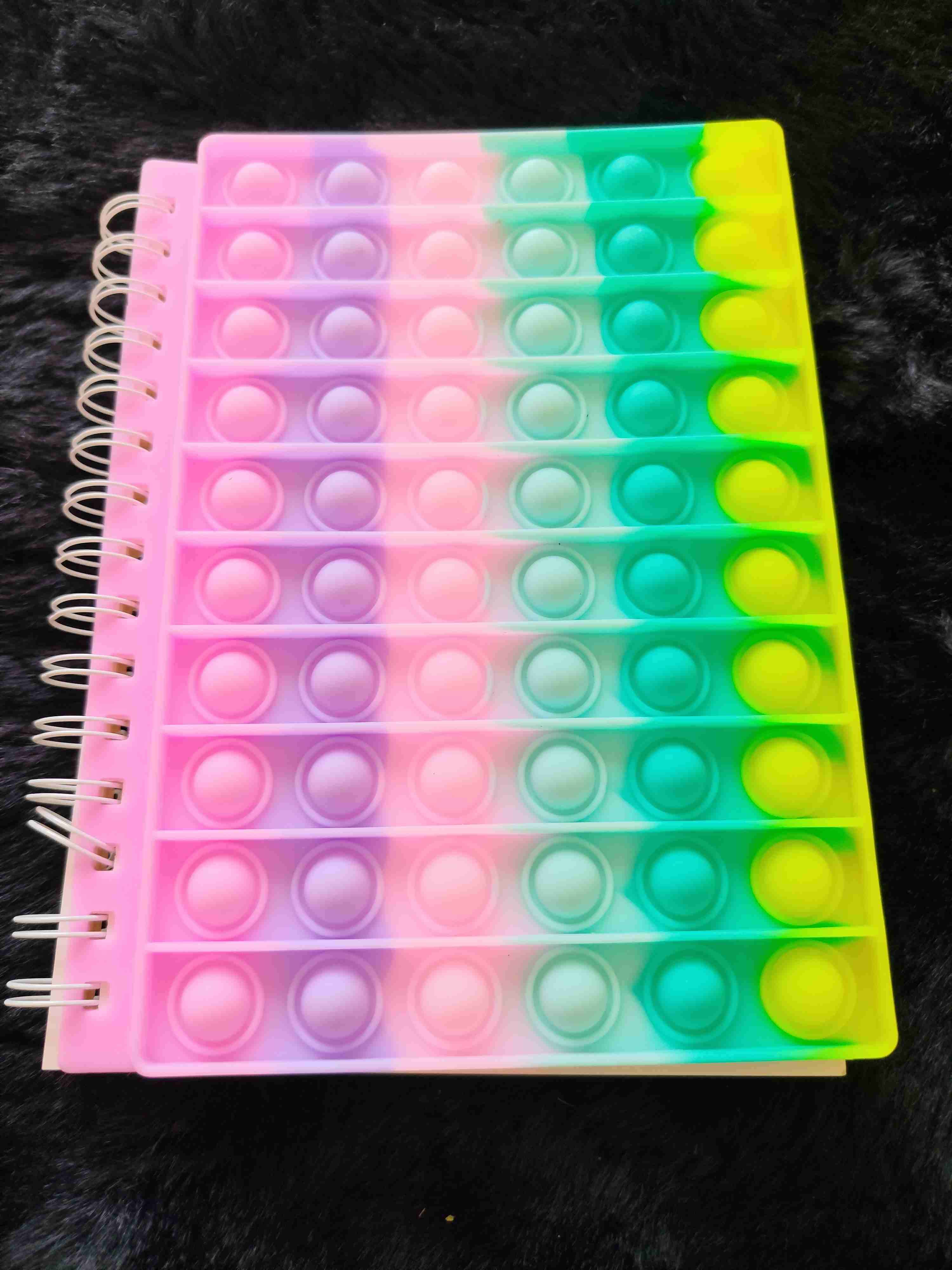 Cuaderno con tapa de pop it en colores pastel. Ideal para estudiantes o para notas creativas. En buen estado.tamaño 20x 15 centímetros también en color rojo