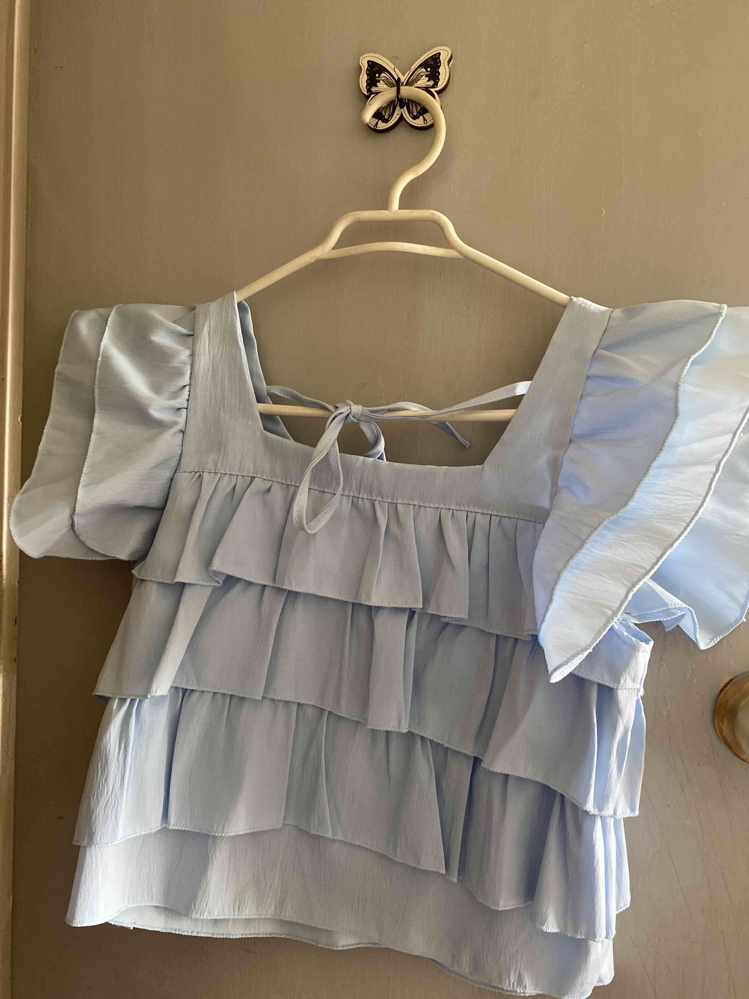 Blusa ligera de color celeste con detalles de volantes. Perfecta para un look veraniego y elegante.