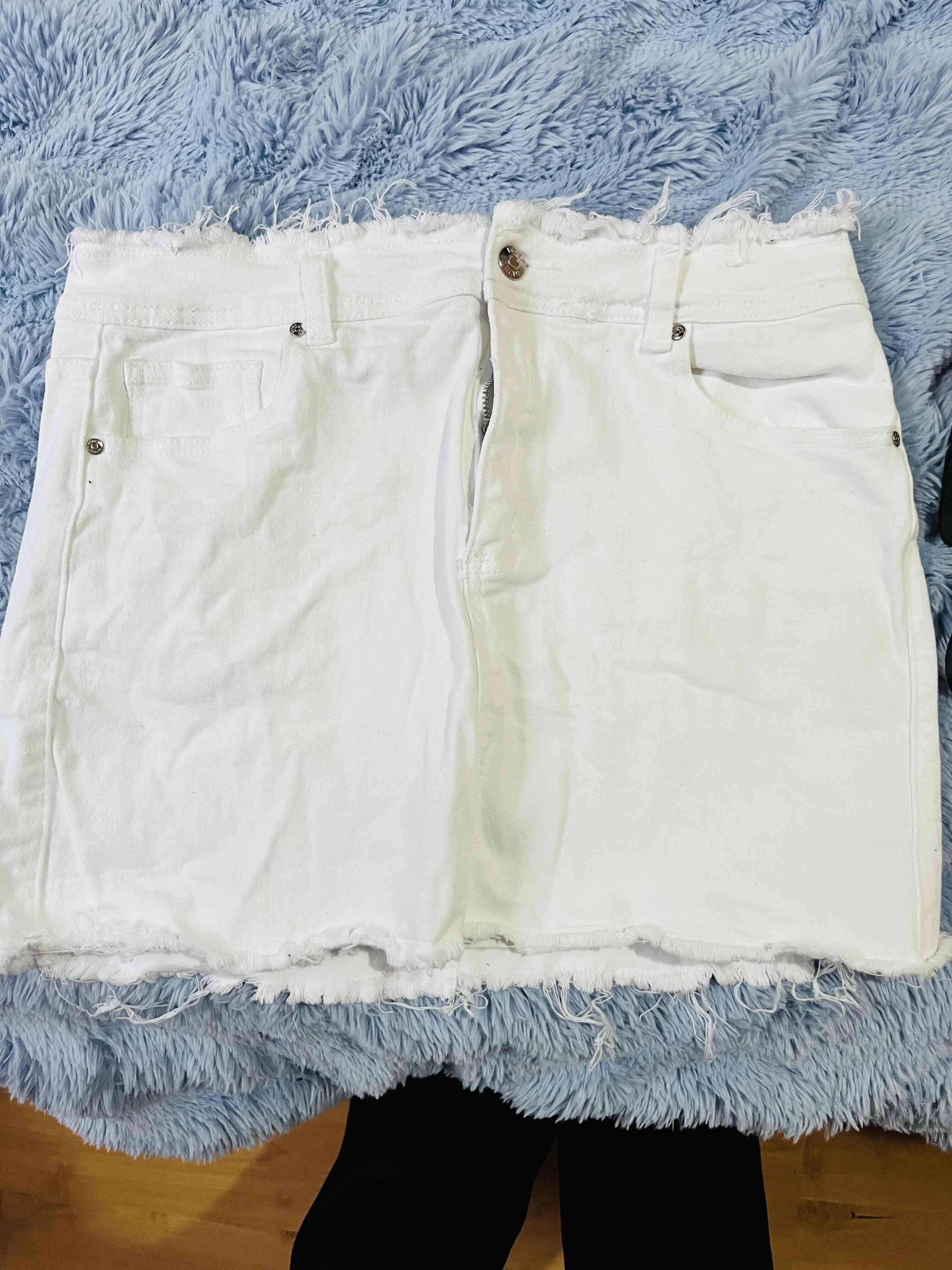 Falda blanca corta con borde desflecado. Ideal para un look veraniego y casual.