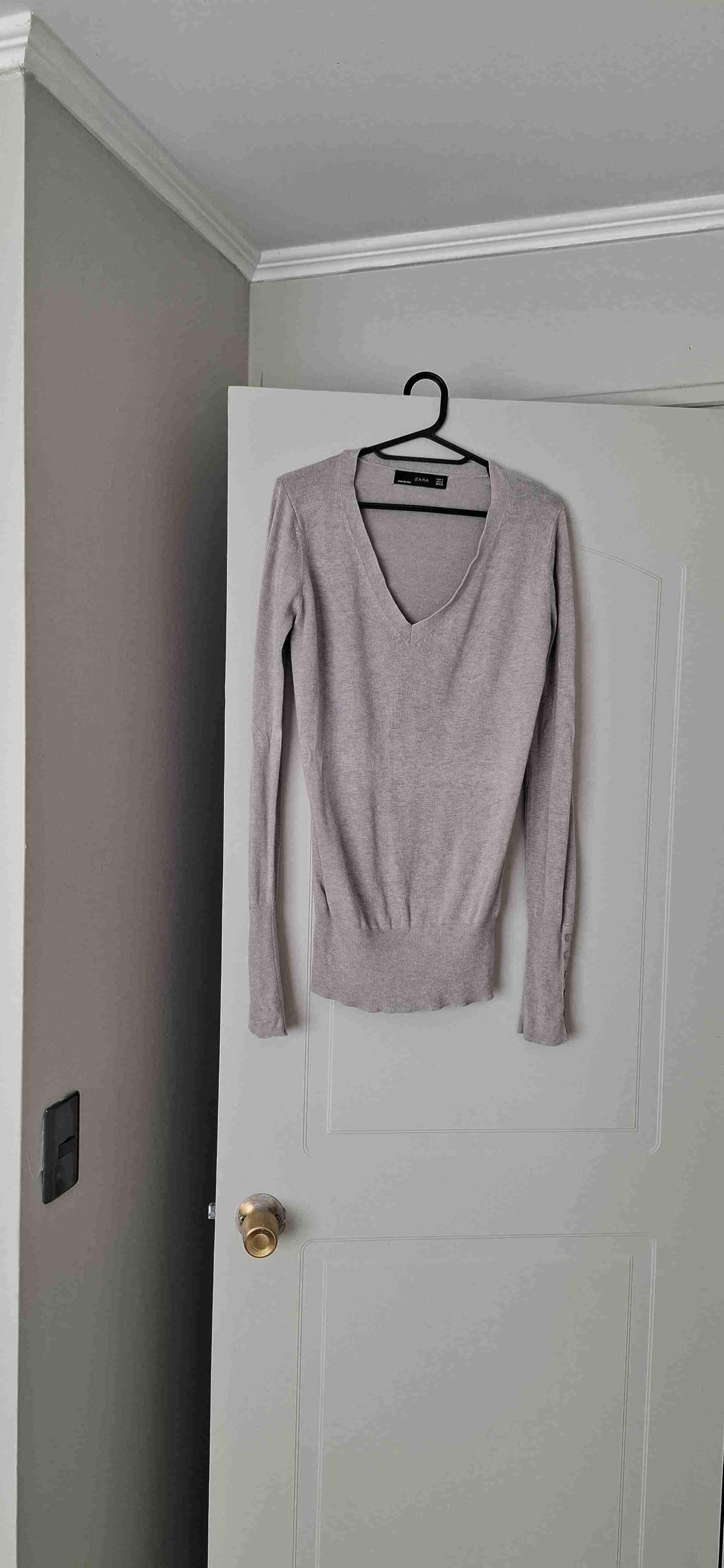 Suéter de mujer cuello en C, en buen estado solo unas pequeñas motas en la superficie. Color gris claro, ideal para días fríos. Perfecto para outfits casuales. Cuenta con botones de adorno en sus mangas, es largo mide 71cm.