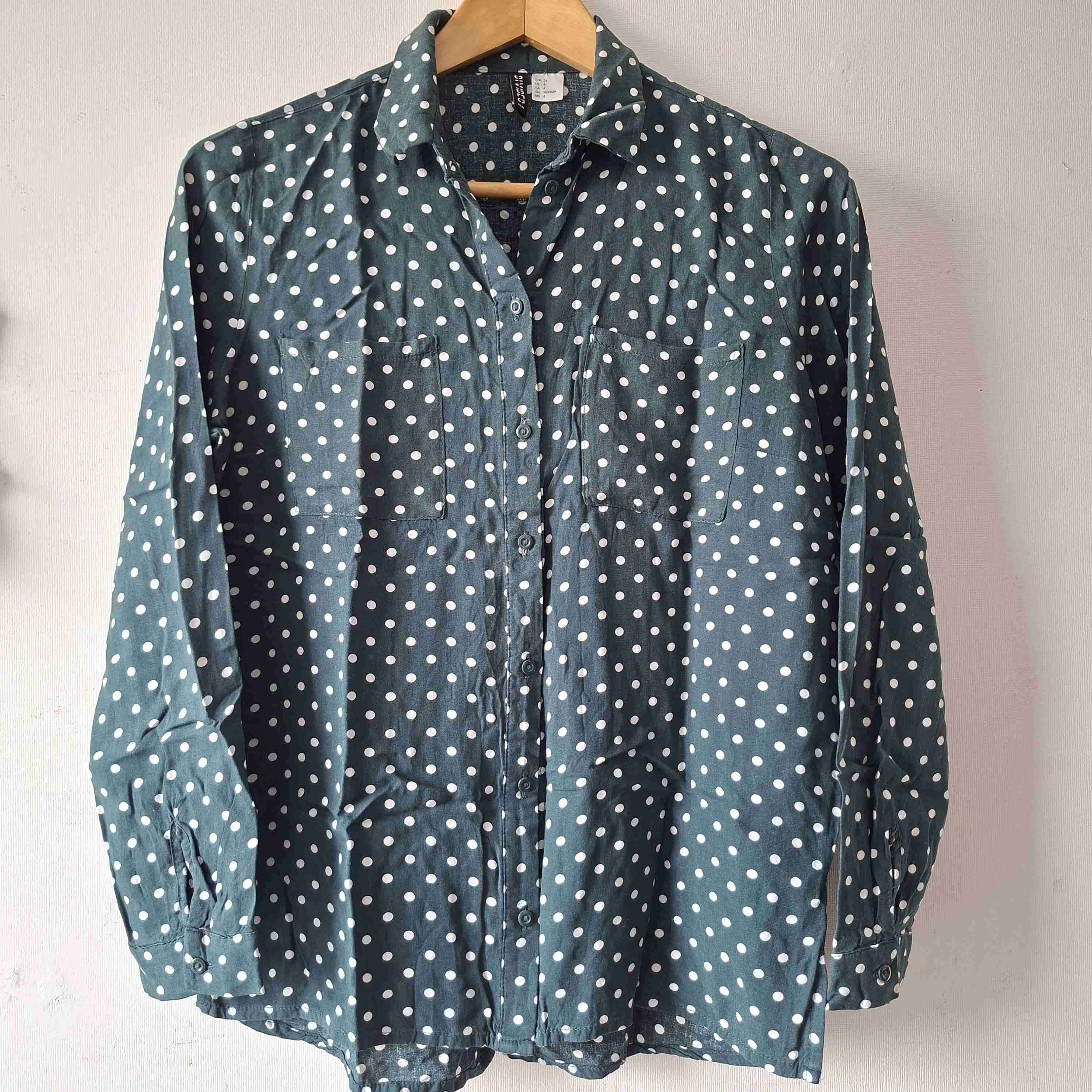 Camisa manga larga verde con lunares blancos, estilo casual. Buen estado, perfecta para uso diario.