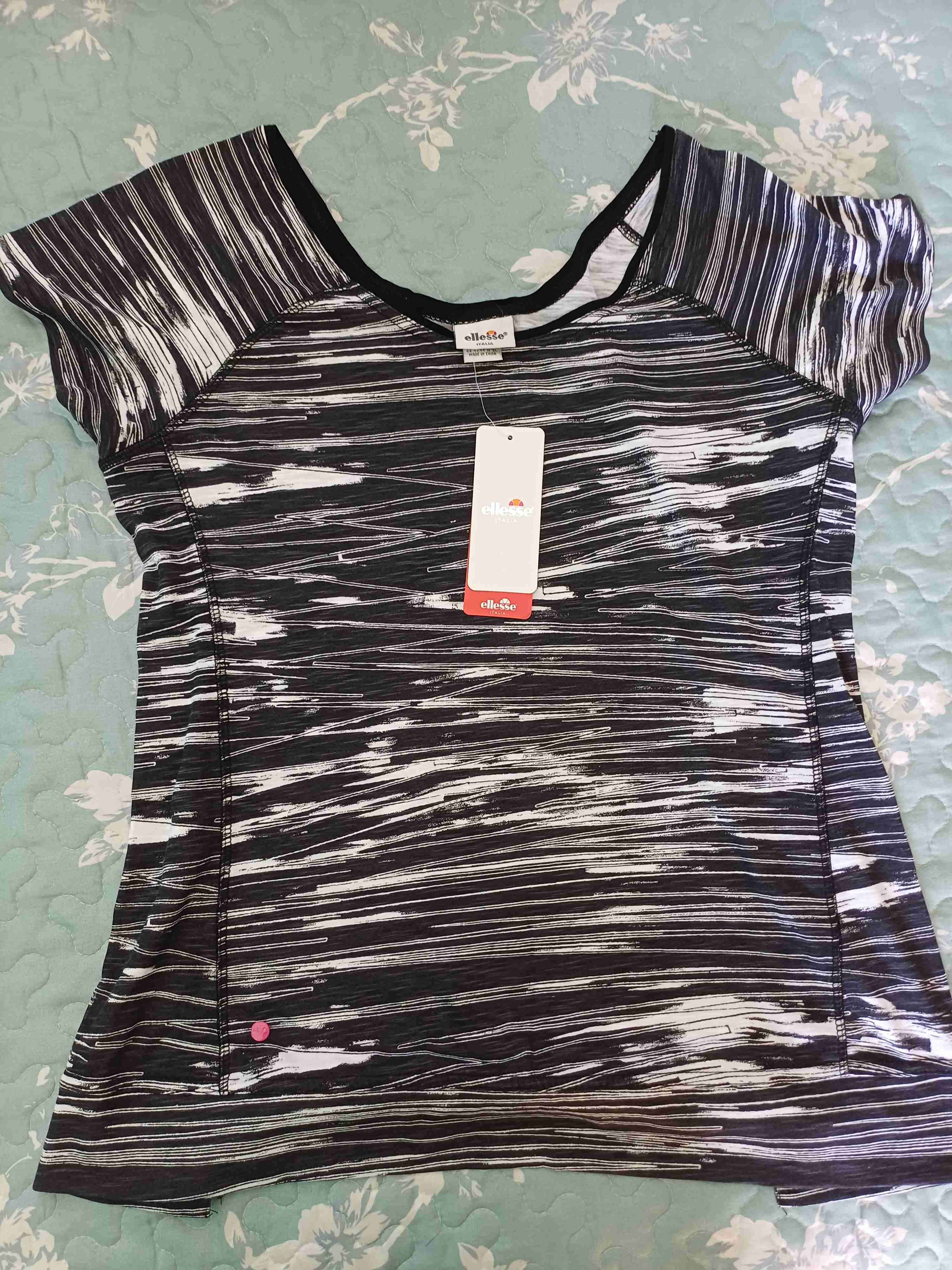 Polera deportiva negra con estampado moderno de algodón. Nueva con etiqueta, ideal para actividades al aire libre.