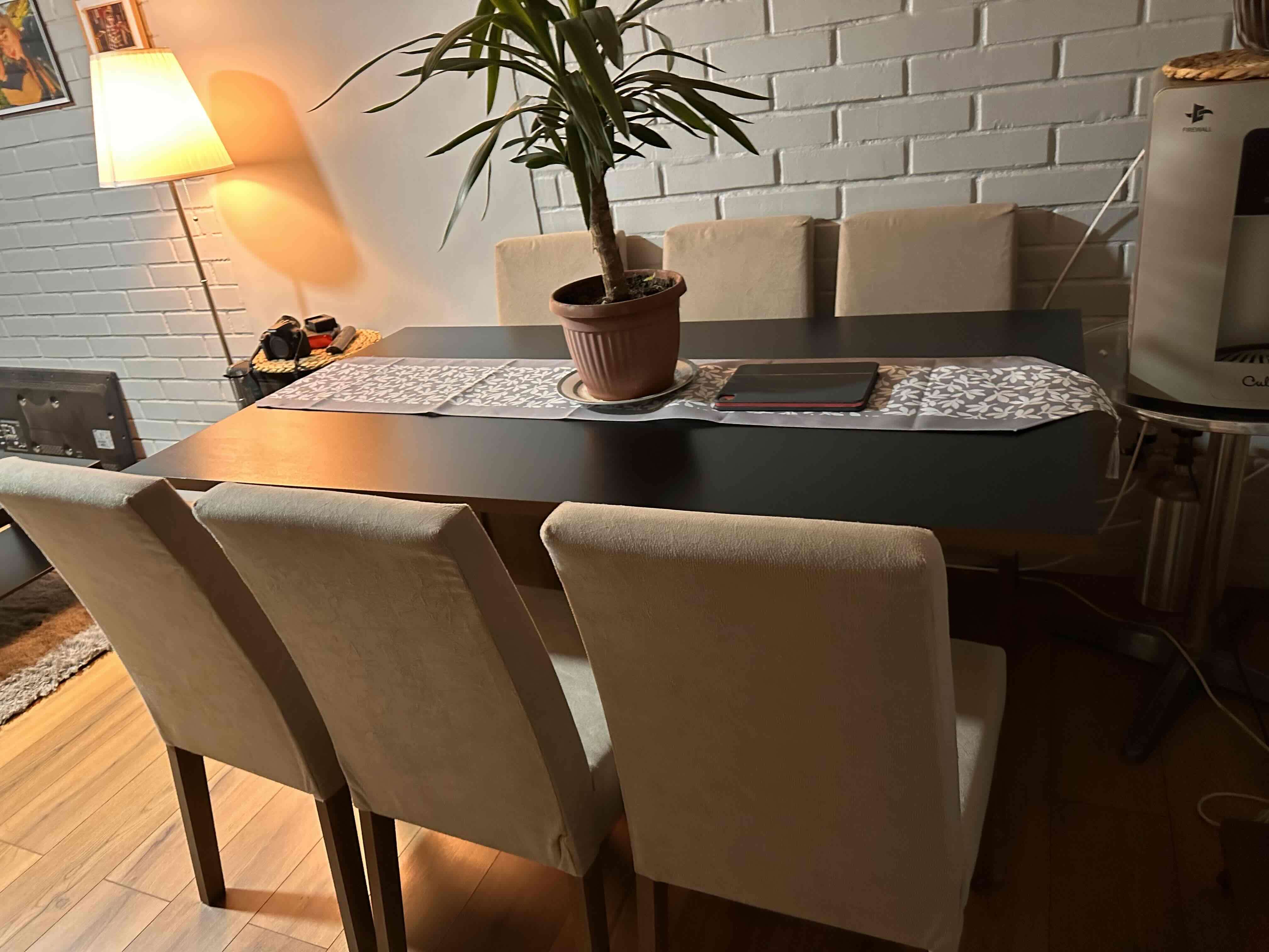 Mesa de comedor moderna con sillas tapizadas en beige. Ideal para espacios acogedores. Buen estado general.