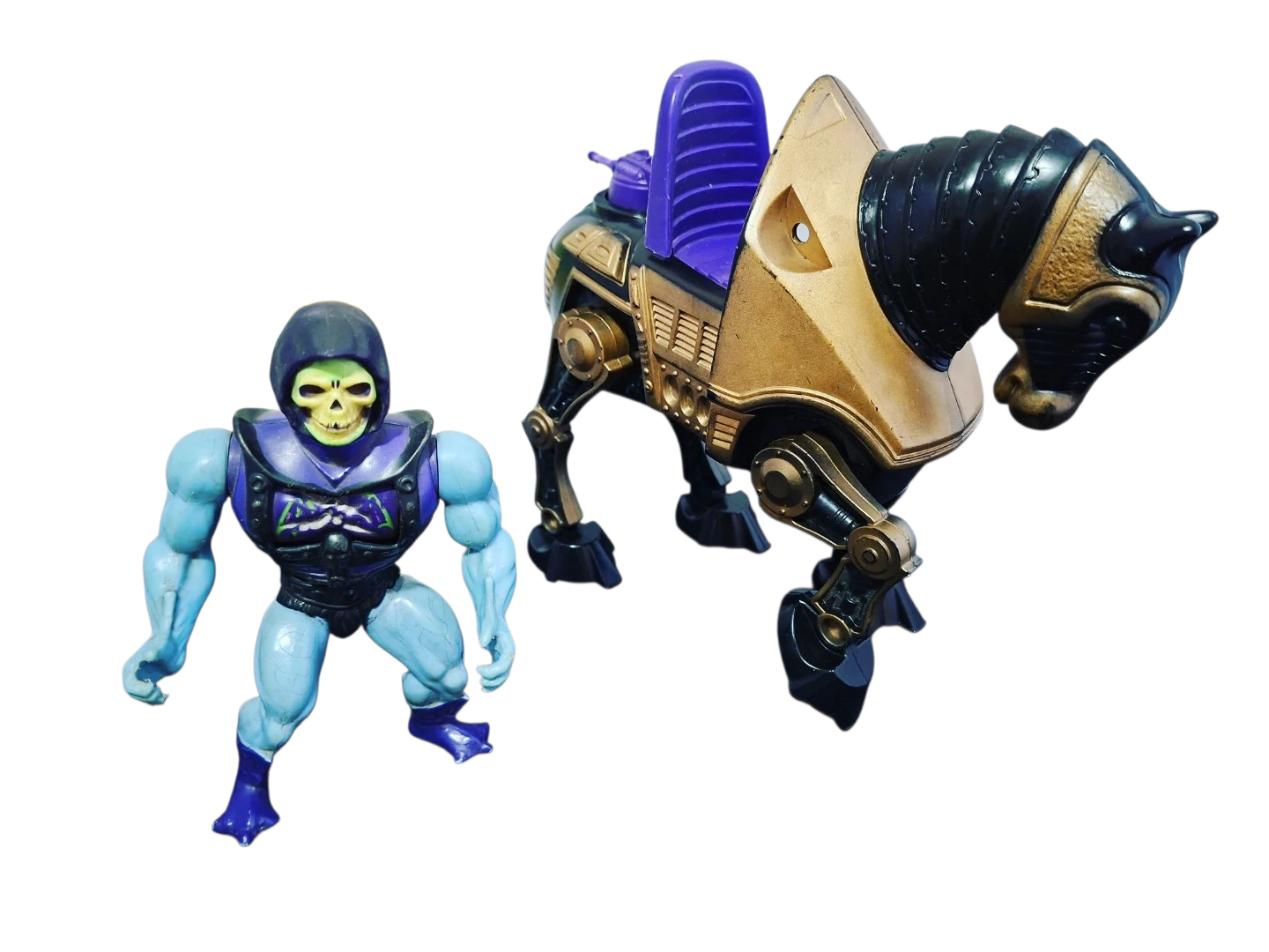 Figura de colección He-Man - MOTU - Maestros del Universo - Skeletor del año 83 - Black Battle Horse del año 83 Valor por ambos en buen estado Detalles faltan accesorios y Horse sin stickers