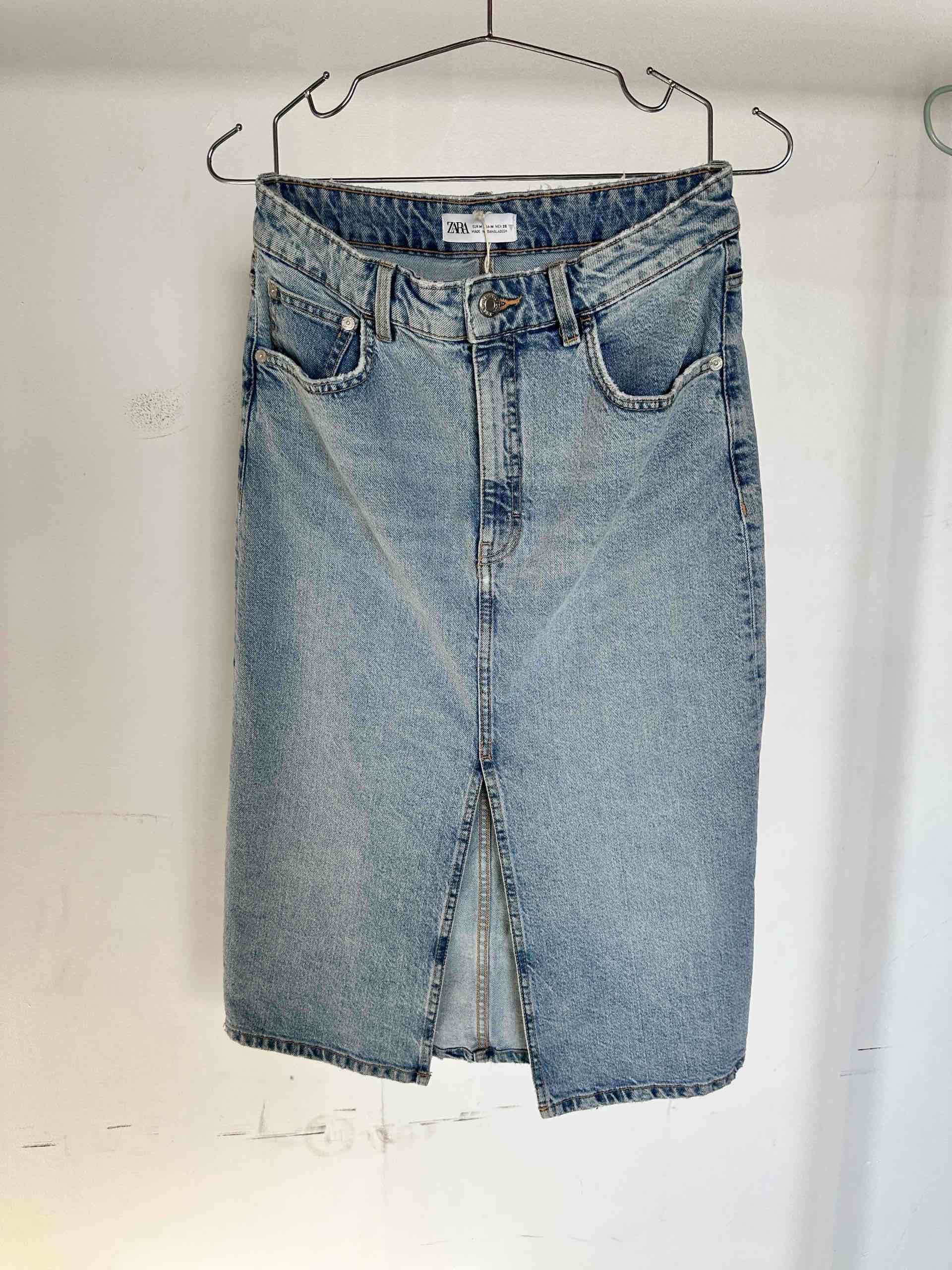 Falda de mezclilla azul clara, estilo casual con abertura frontal. En buen estado.