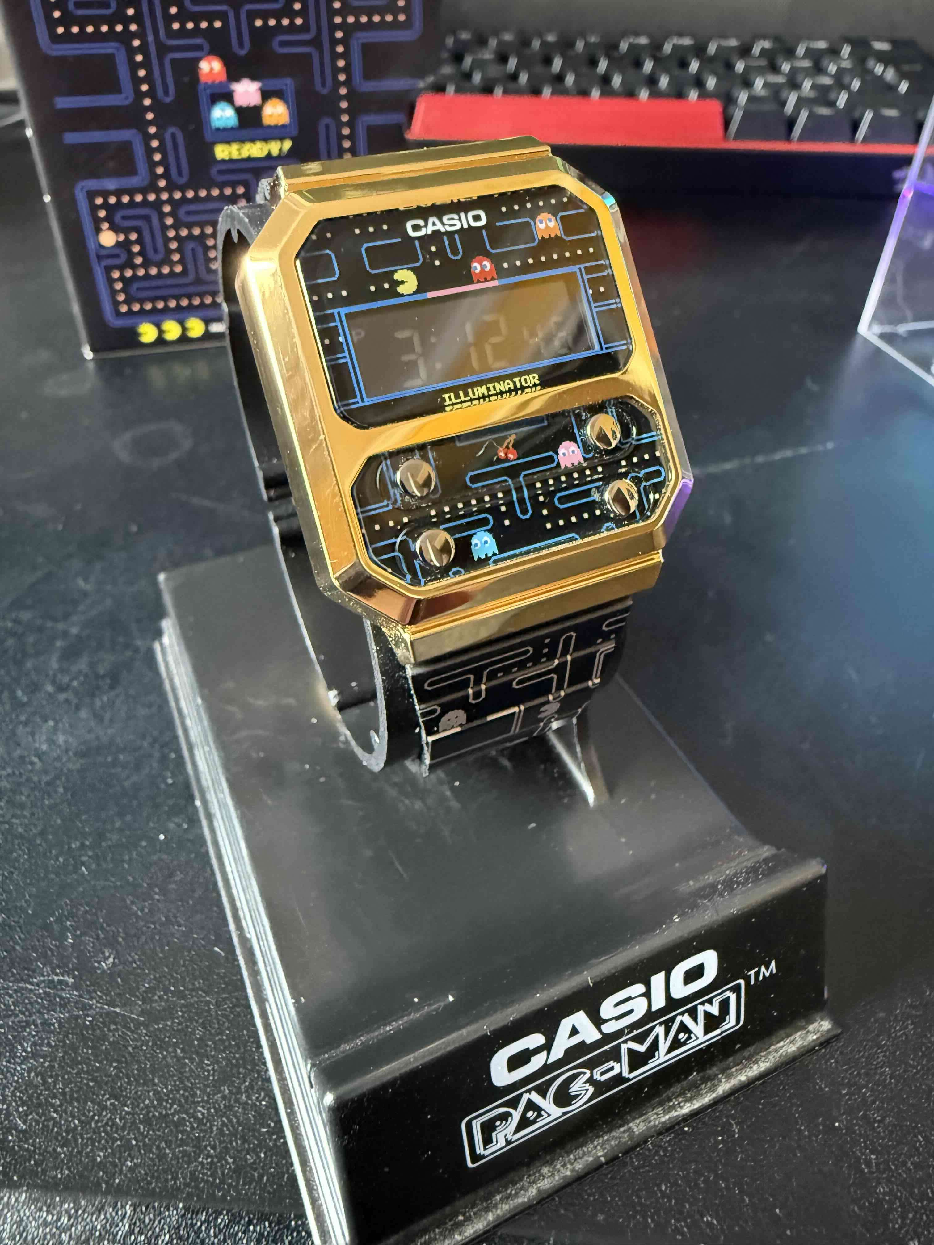 El primer reloj completamente plástico hecho por Casio a finales de los 70s fue el legendario F-100, un reloj muy conocido por su aparición en la película Alien (1979). Bueno nuestros amigos de la compañía japonesa conscientes de esto decidieron relanzar este famoso modelo de la mano de los modelos A100, que mantienen la caja de resina plástica, pero con correas de acero inoxidable. Tienen botones frontales para cambiar sus funciones. Tiene luz , cronómetro, calendario y alarma incorporada. Este en particular es una edición limitada hecha junto con Bandai para el videojuego de Pac-Man o Pacman .