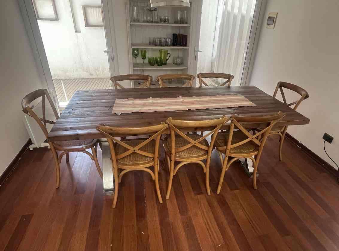 Mesa de comedor de madera con diseño rústico y 10 sillas a juego. Ideal para comedores grandes, en buen estado con signos leves de uso. Entrega en Vitacura.