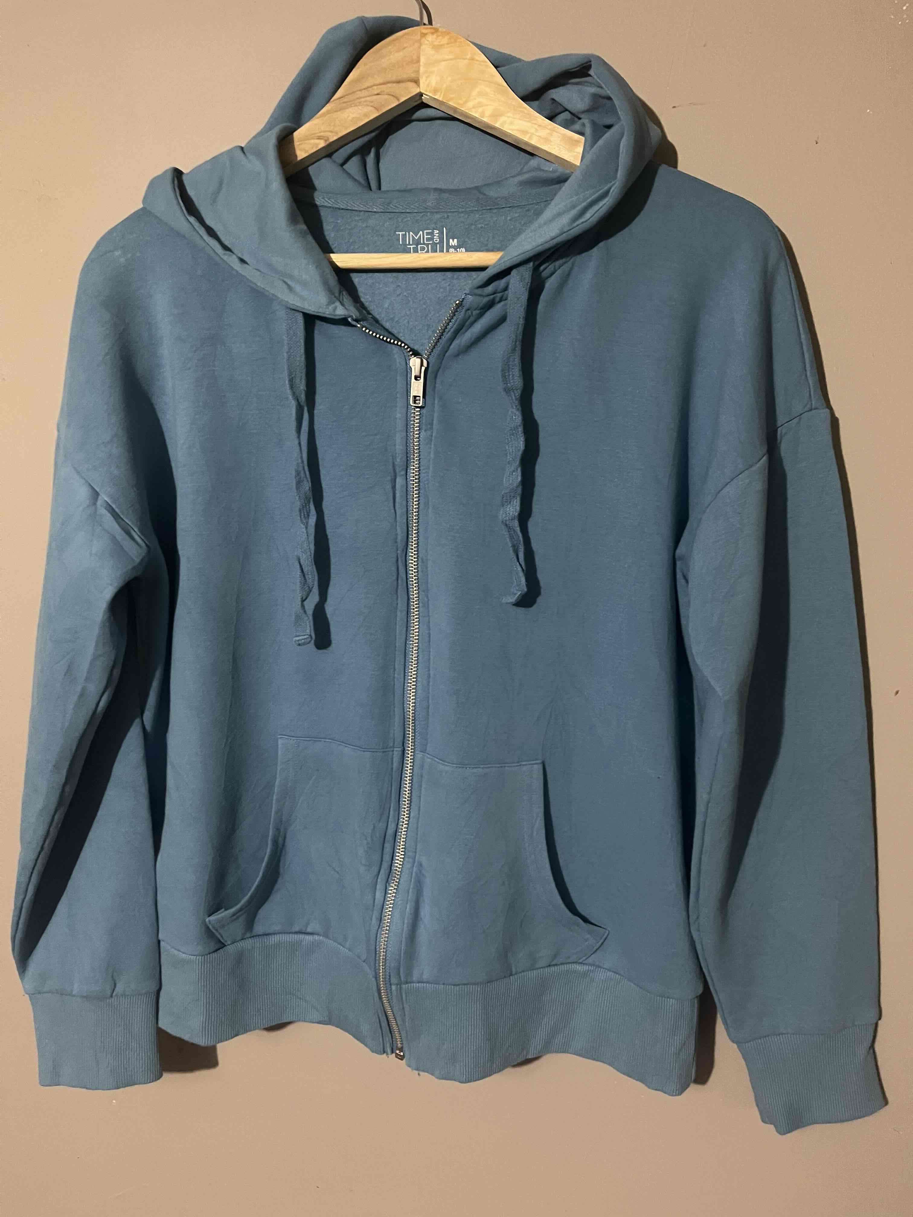 Polerón azul petróleo claro con cierre y capucha. Perfecto para días frescos. En buen estado general.