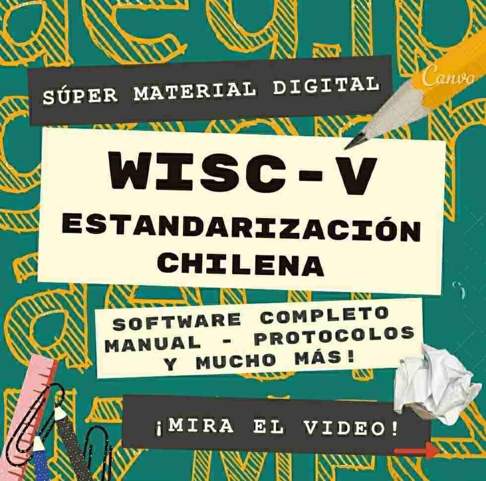 Buen día, vendo MATERIAL DIGITAL WISC-V ESTANDARIZACIÓN CHILENA (de uso ilimitado)! Incluye: * SOFTWARE COMPLETO WISC-V (Para realizar la anotación de puntajes, análisis de índices principales y secundarios, análisis de escalas y subpruebas, fortalezas y debilidades, análisis de proceso, observaciones de proceso y elaboración de informe tipo). * Manual de aplicación y administración. * Protocolo de Registro de Aplicación. * Protocolo de Registro de Resultados. * Cuadernillos de respuestas y Plantillas de corrección (Cancelación, Claves y Búsqueda de Símbolos). * Documentos complementarios (Consignas de cada subprueba, Habilidades por índice, Ámbitos de evaluación por subprueba) * Estudios e investigaciones relacionadas (Estudios en población urbano-rural, Estudios de memoria de trabajo y atención, Estudios de género y WISC-V, otros). TODO SÓLO POR $5.000 🙌🏼