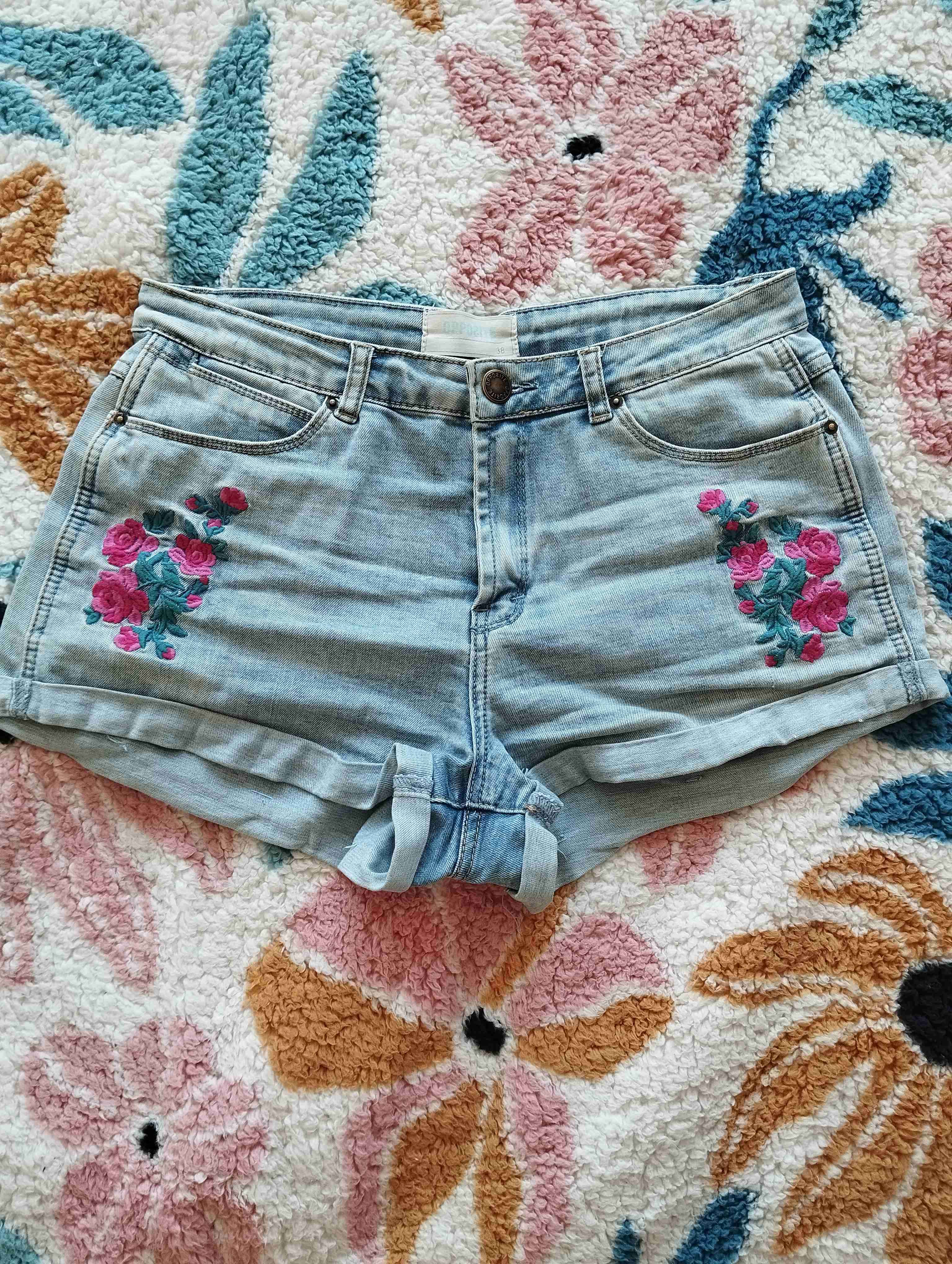 Shorts de mezclilla con diseño floral bordado, perfecto para el verano. En buen estado y cómodos para usar diariamente.