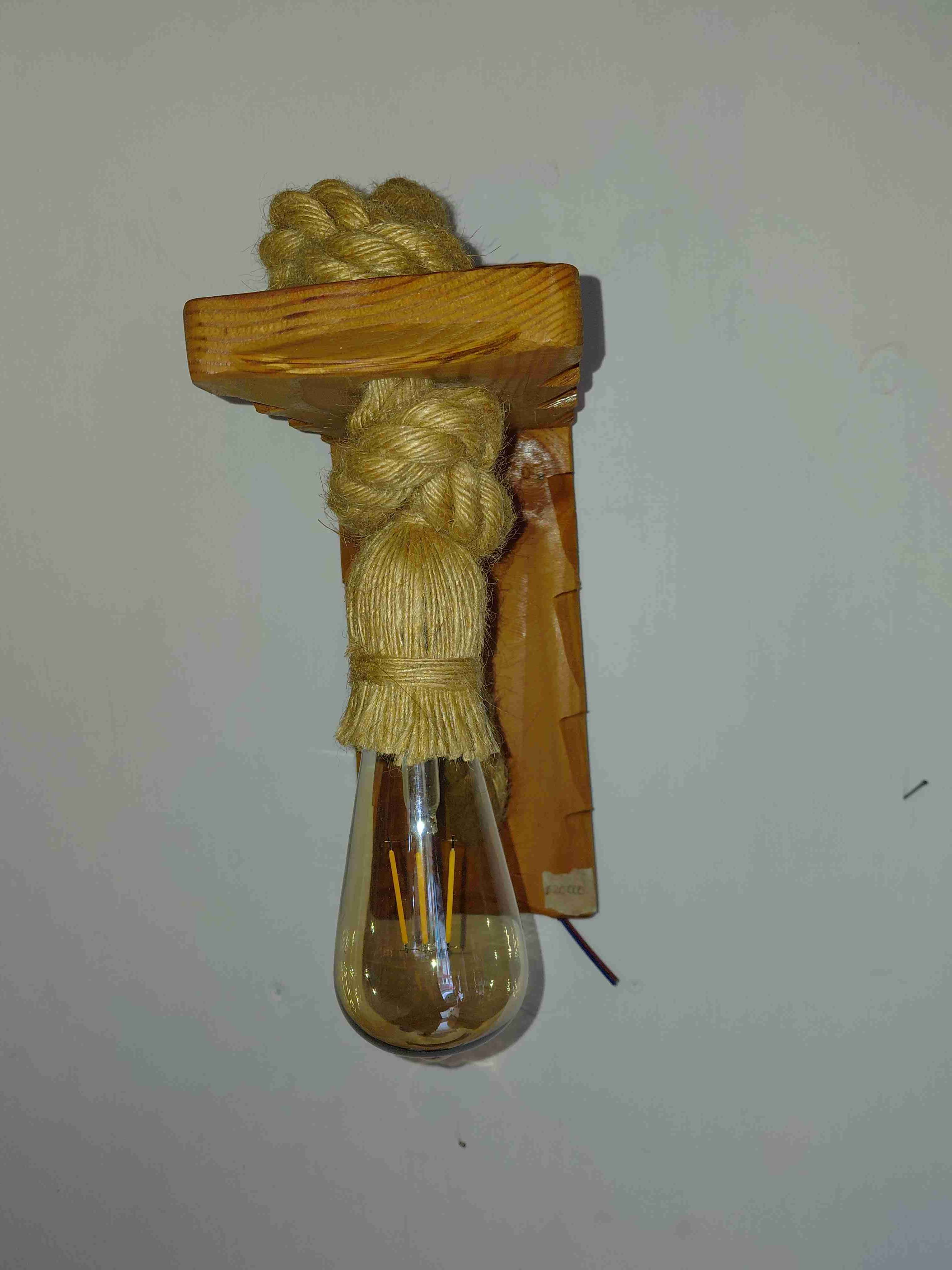 Lámpara de pared estilo rústico con detalle de cuerda. Ideal para decoración de interiores. Funciona perfectamente.