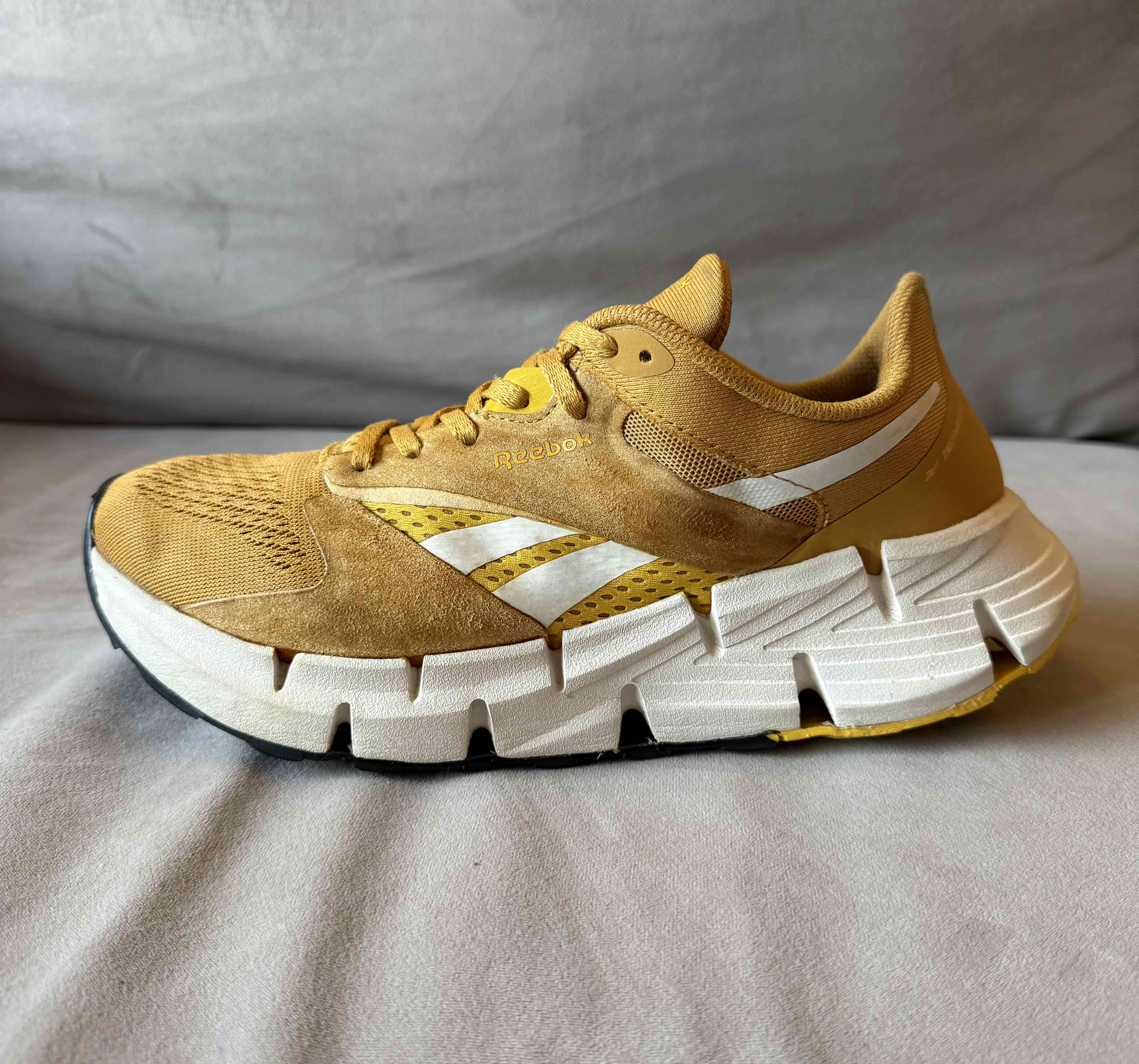 Zapatillas Reebok en color amarillo, estilo moderno y cómodo. En buen estado general, ideal para uso diario o deportivo.