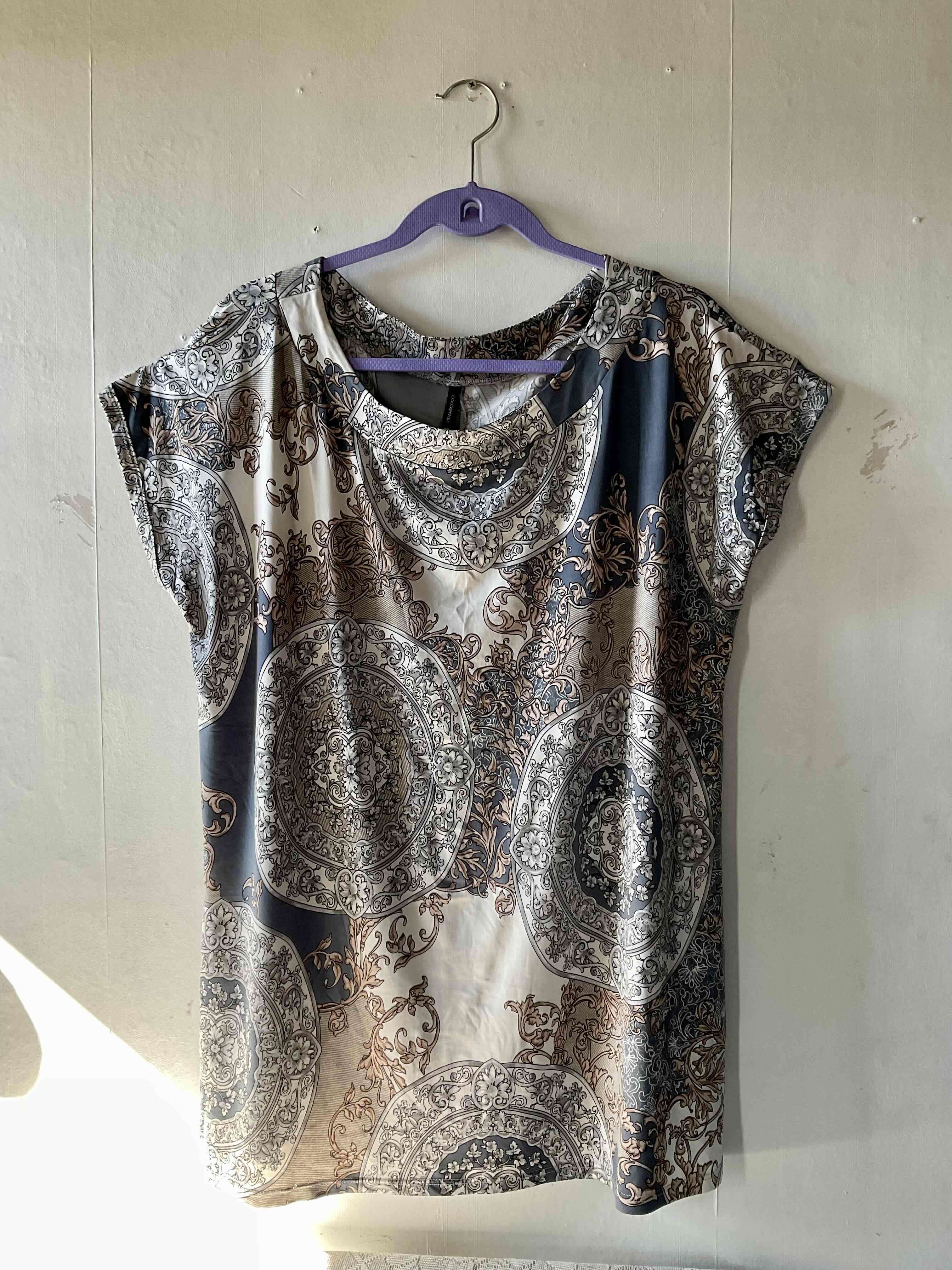 Blusa con estampado elegante en tonos negros y marrones. Perfecta para salir o el trabajo, en buen estado general.