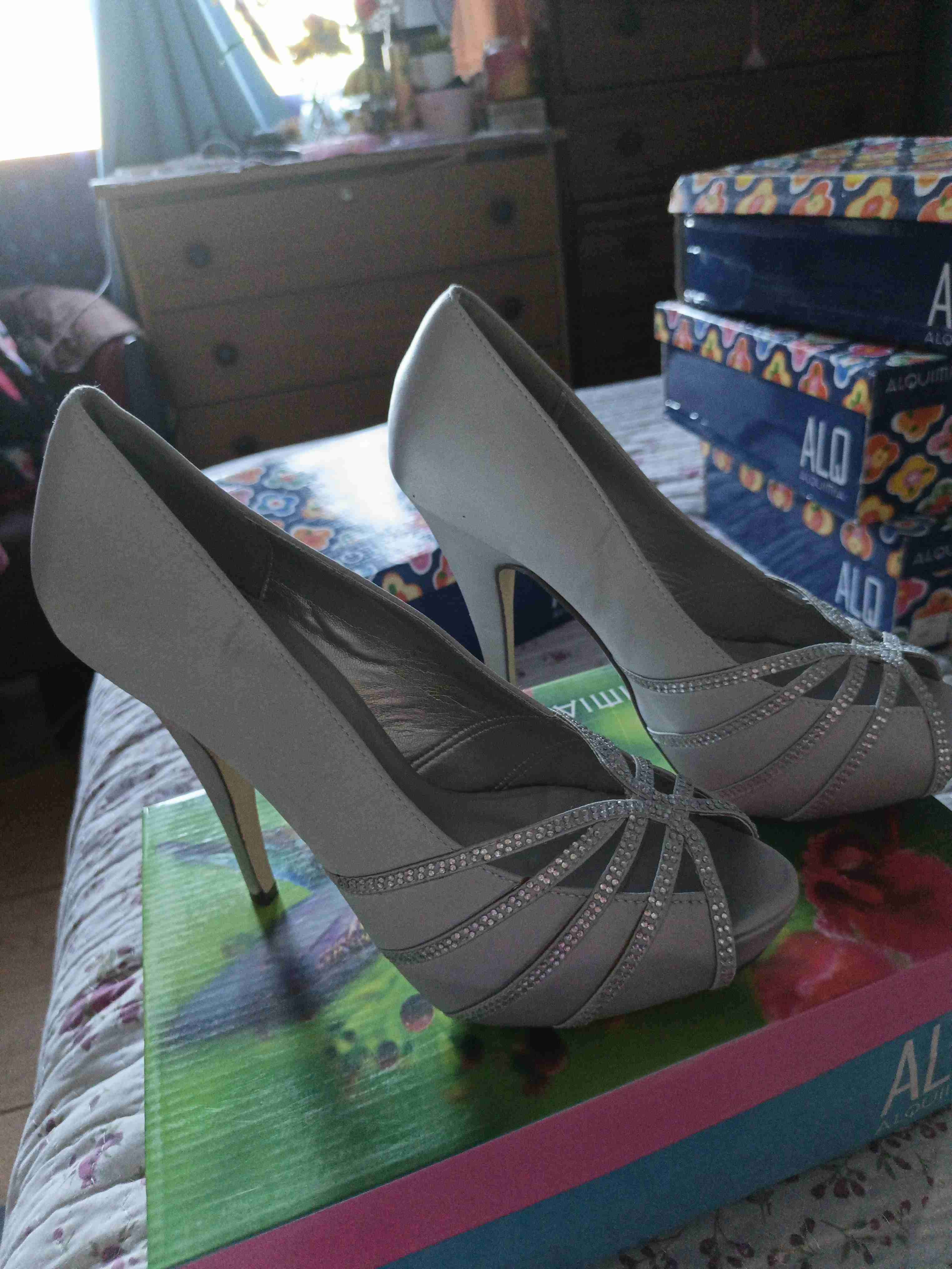 Elegantes zapatos de tacón plateados con detalles brillantes. Perfectos para ocasiones especiales.