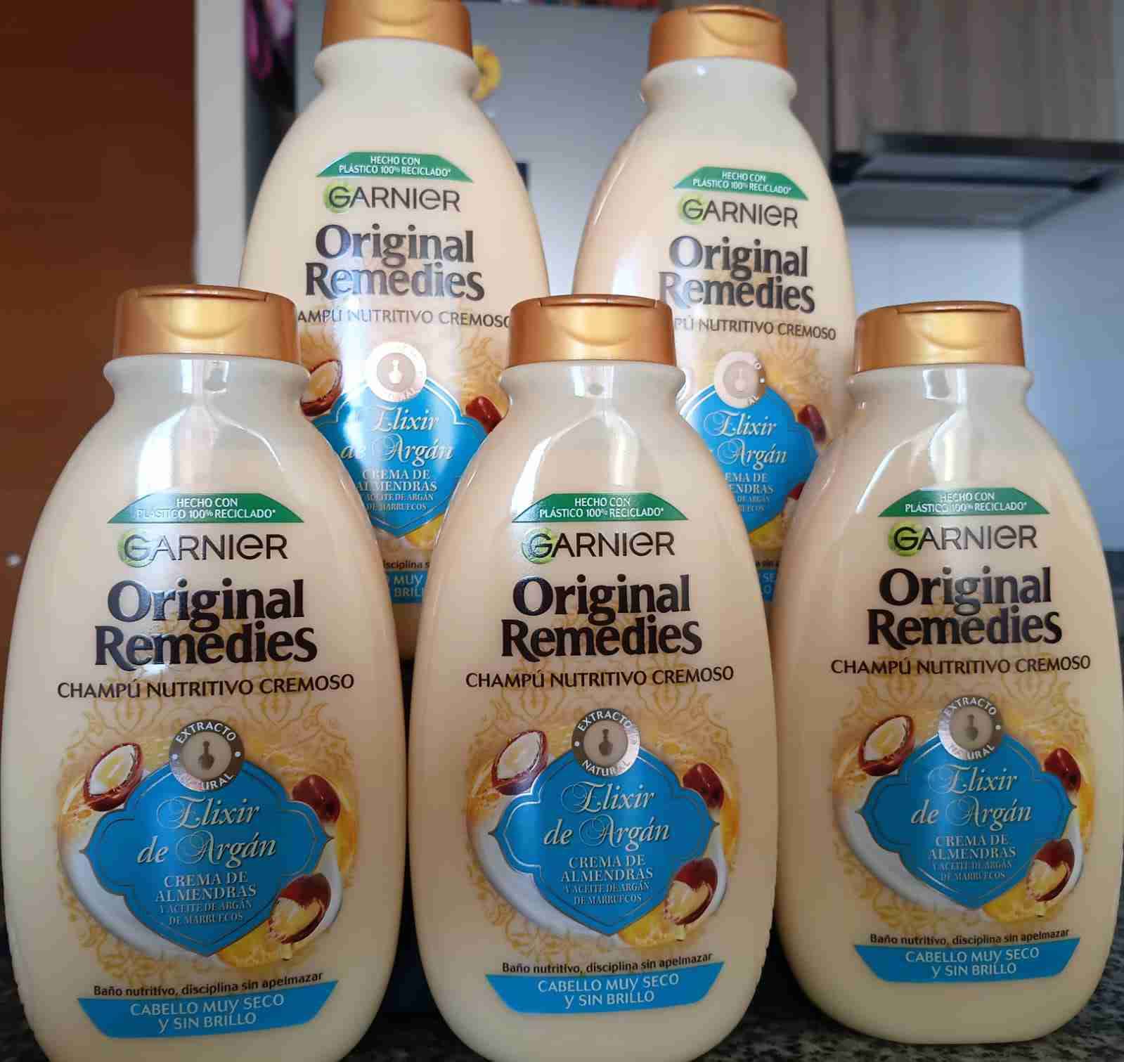 Shampoo nutritivo cremoso con elixir de argán. Ideal para cabello muy seco y sin brillo. Fórmula hidratante y suavizante.