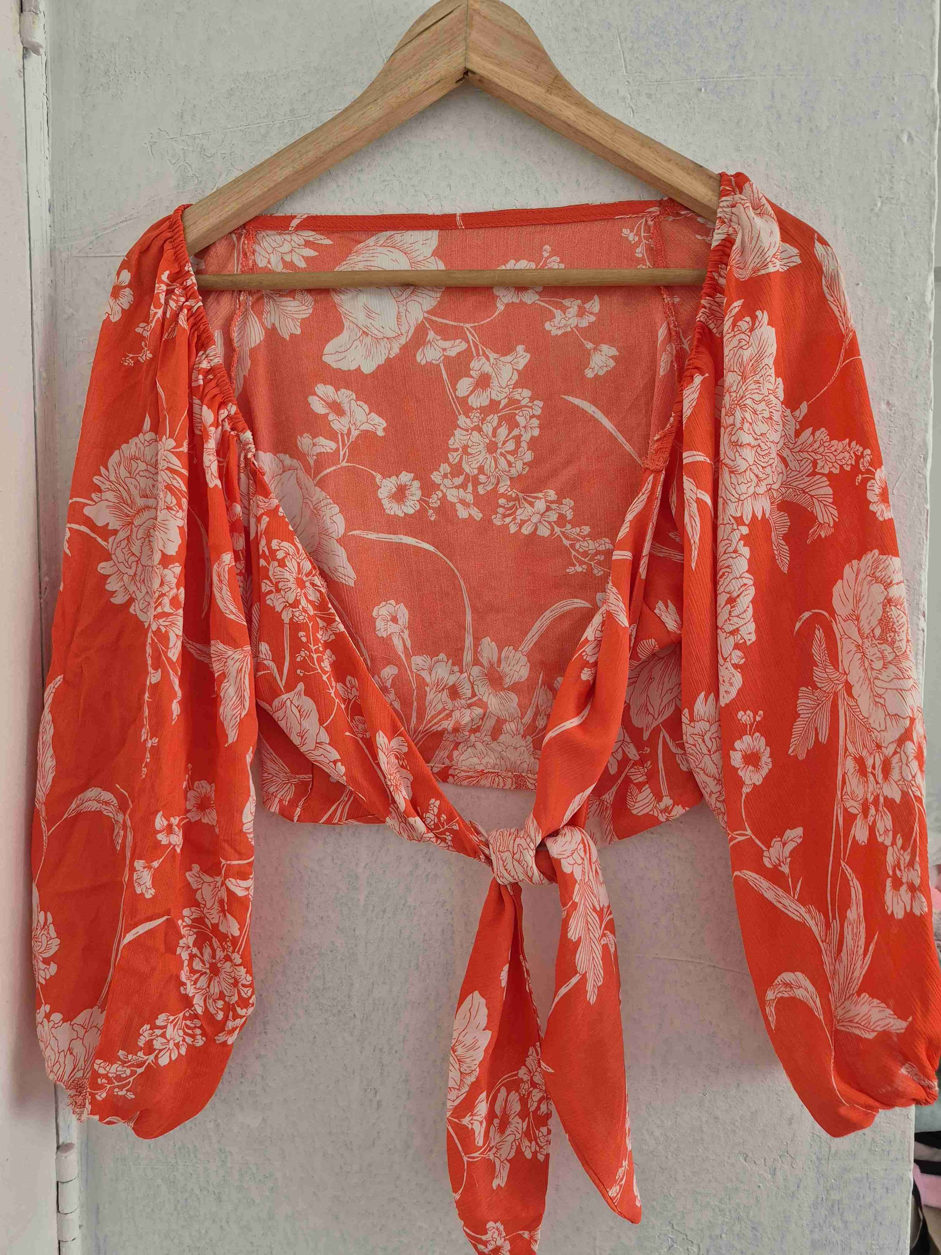 Blusa roja con diseño floral, estilo fresco y femenino. Ideal para ocasiones casuales. Buen estado general, con signos leves de uso.