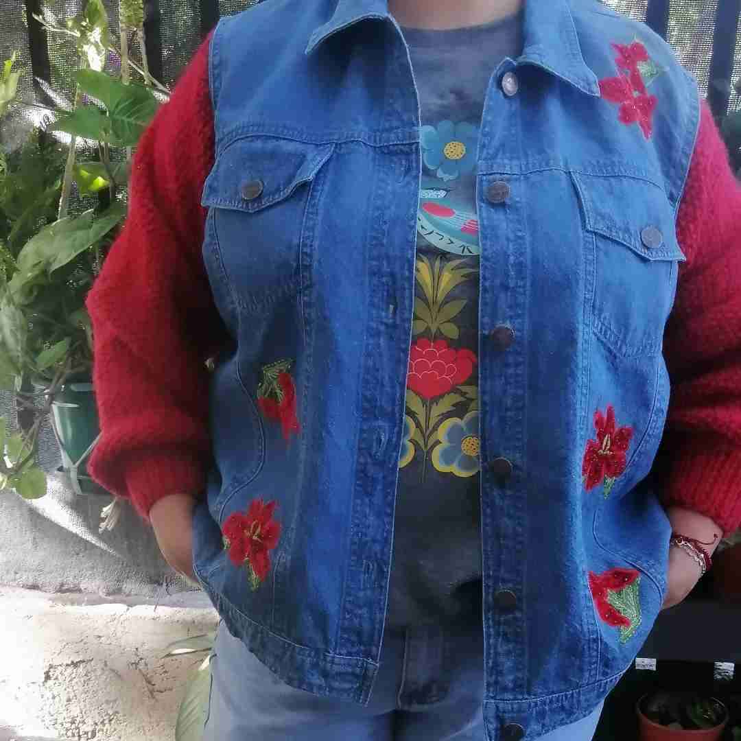 Chaleco de mezclilla con bordados rojos, estilo casual y único. En buen estado, ideal para días frescos.