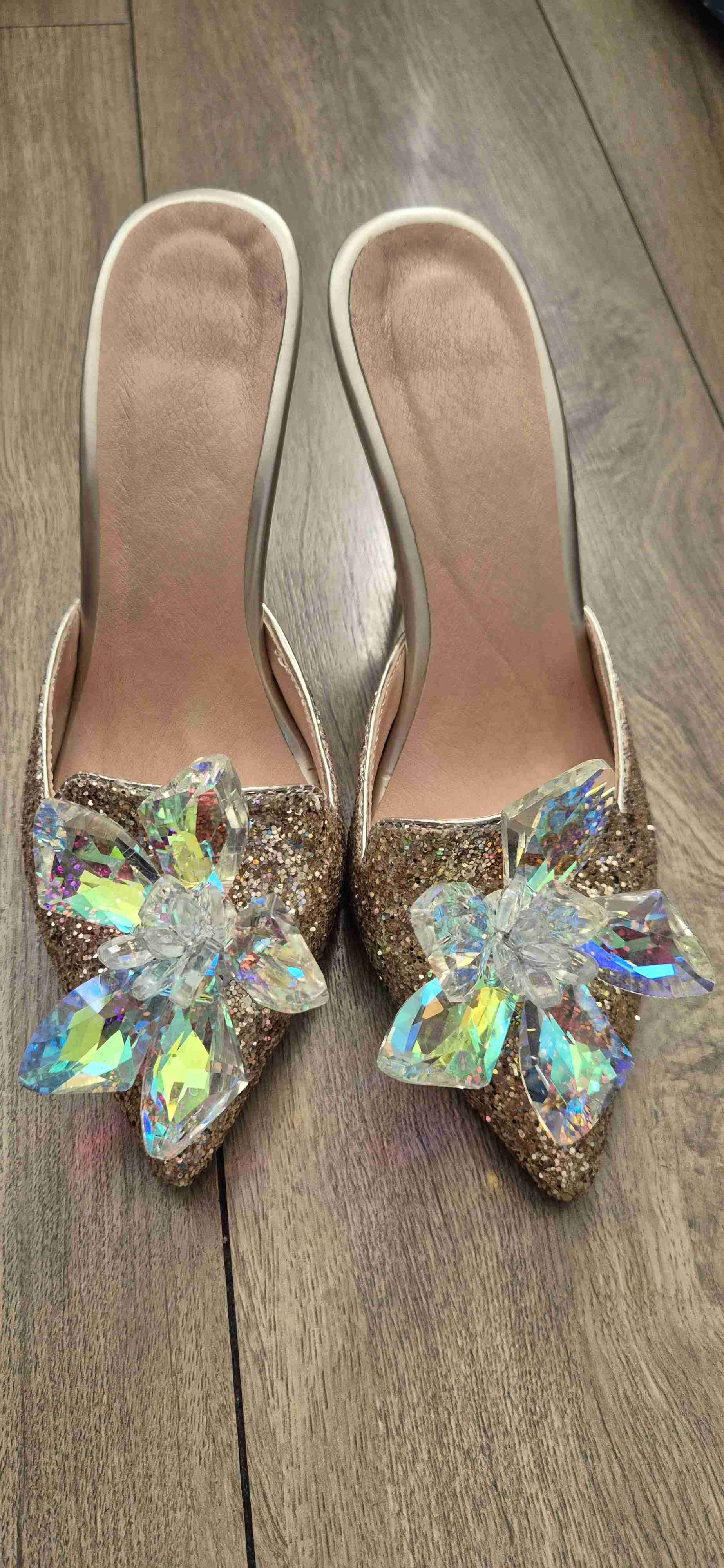 Elegantes sandalias con detalles brillantes y aplicaciones en forma de flor. Ideal para eventos especiales. En buen estado.