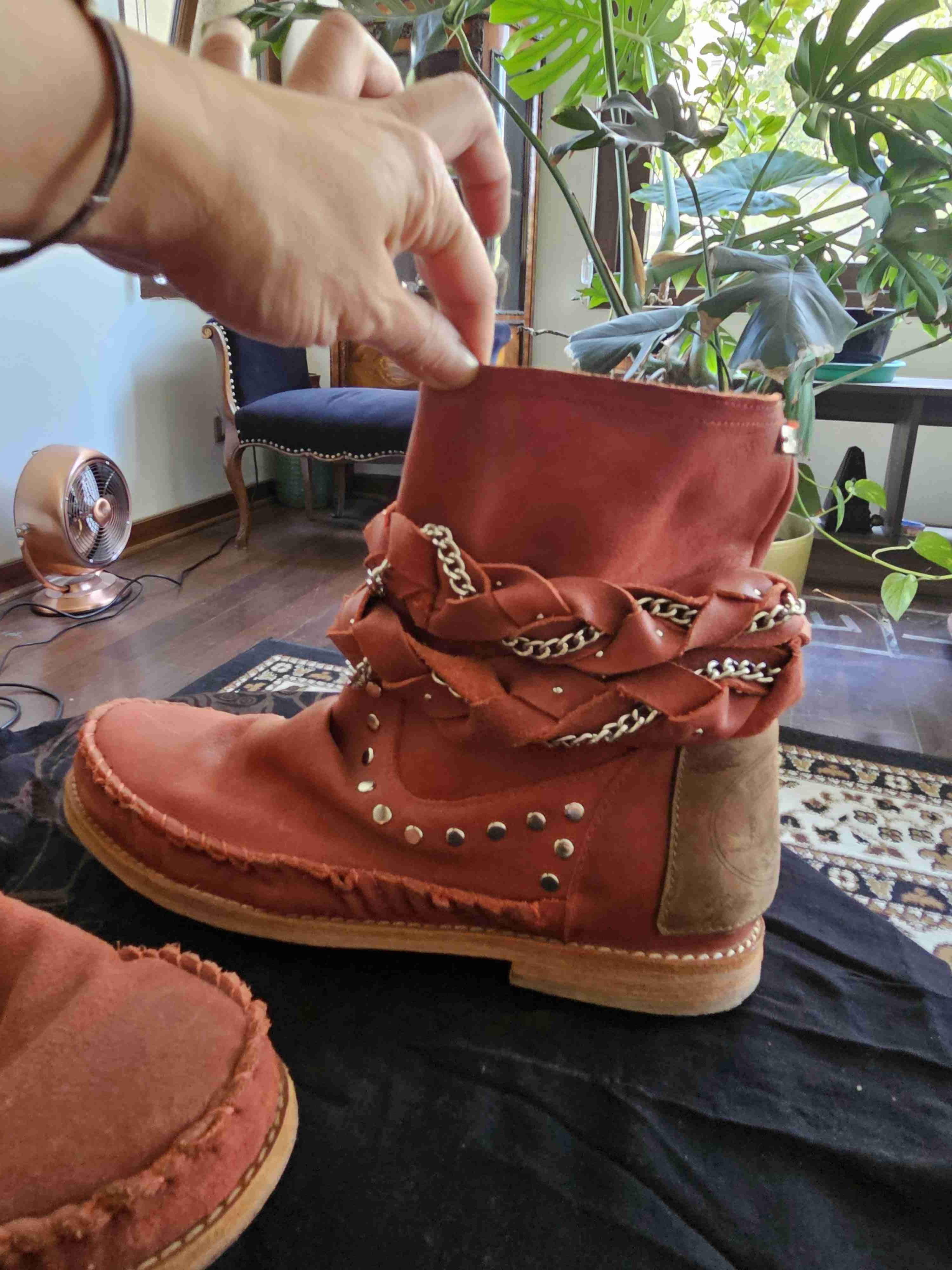Botines de cuero marrón con detalles de cadenas y tachas. Buen estado, ideales para un look original y casual.