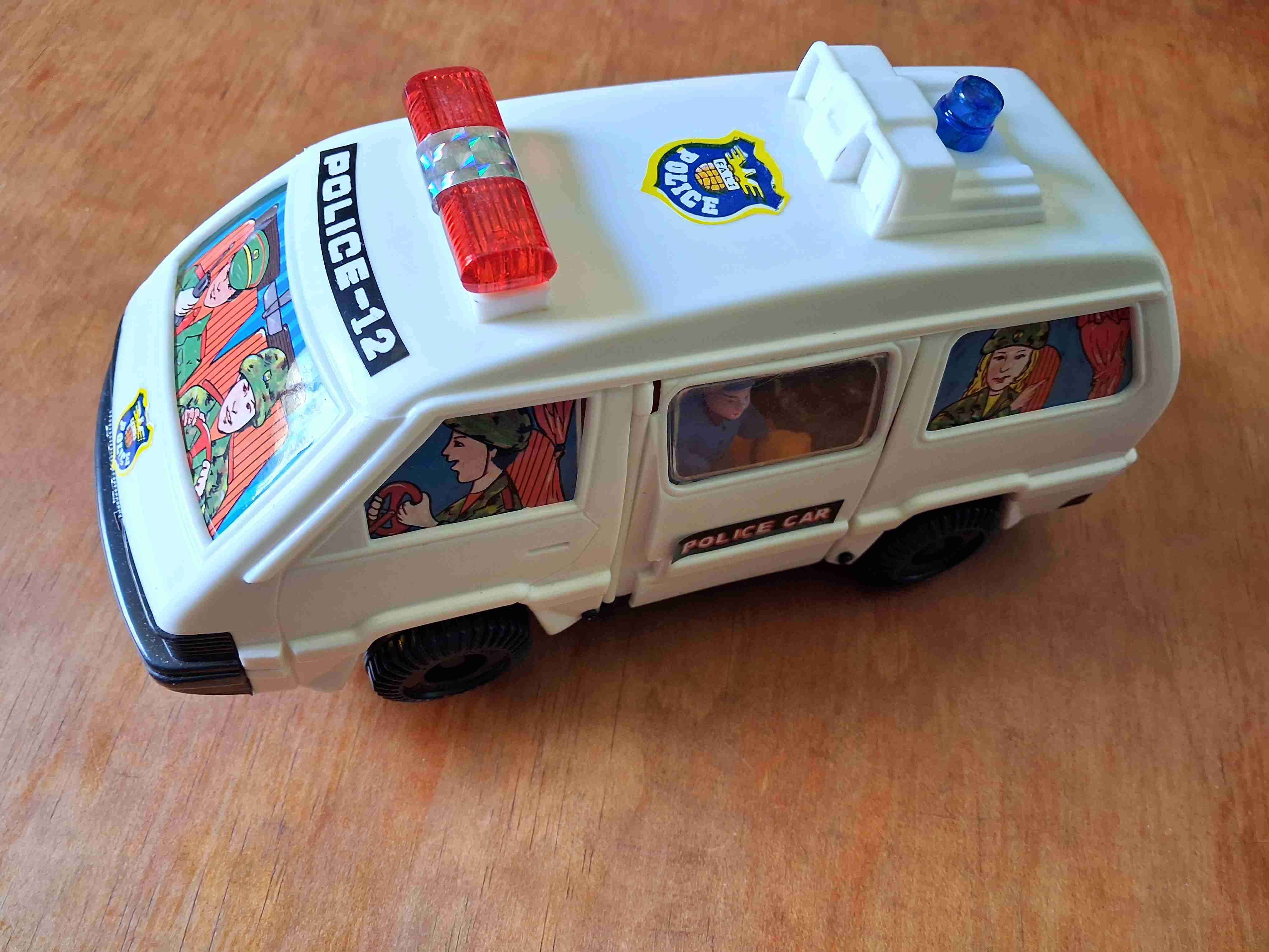 Furgón de juguete tipo policía con gráficos coloridos. Ideal para niños y coleccionistas de juguetes retro.
