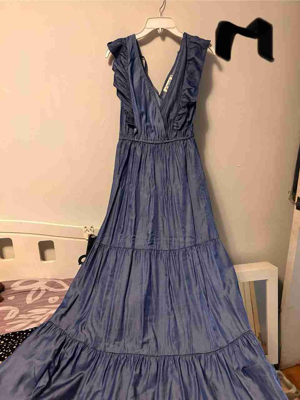 Elegante vestido largo color azul con detalles de volantes. Ideal para ocasiones especiales. En buen estado,