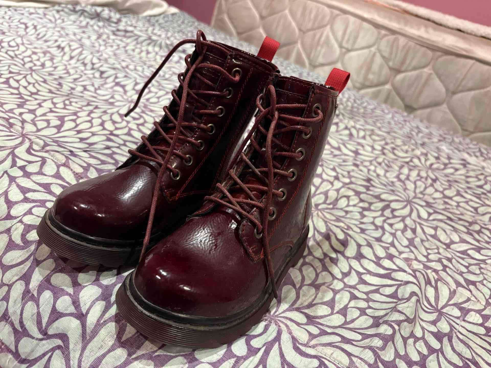 Botines burdeos de cuero sintético con cordones. Perfectos para un look casual. En buen estado general. Talla chile 30