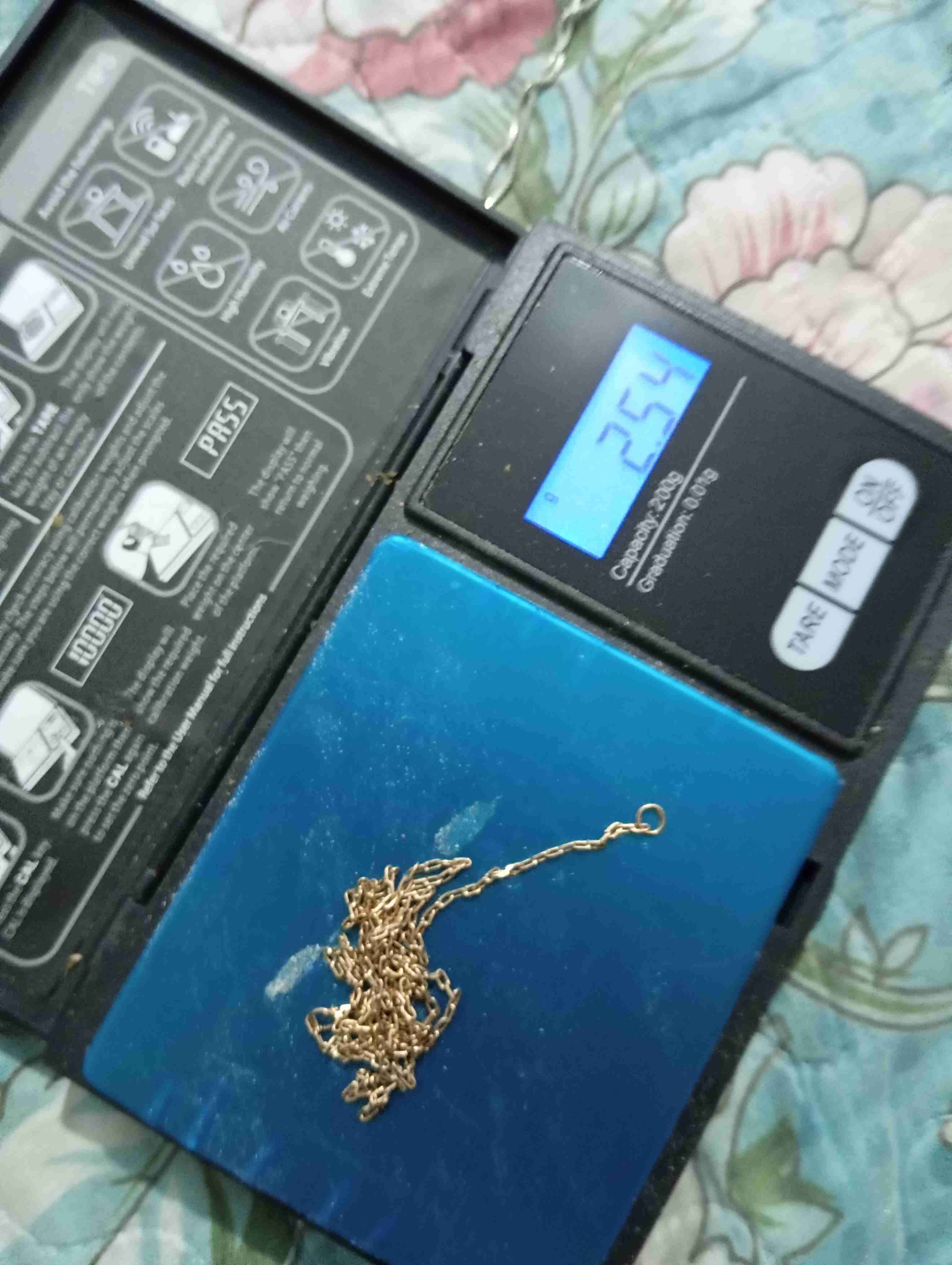 Cadena de oro ligera, ideal para uso diario. Bien cuidada, solo le falta el broche.