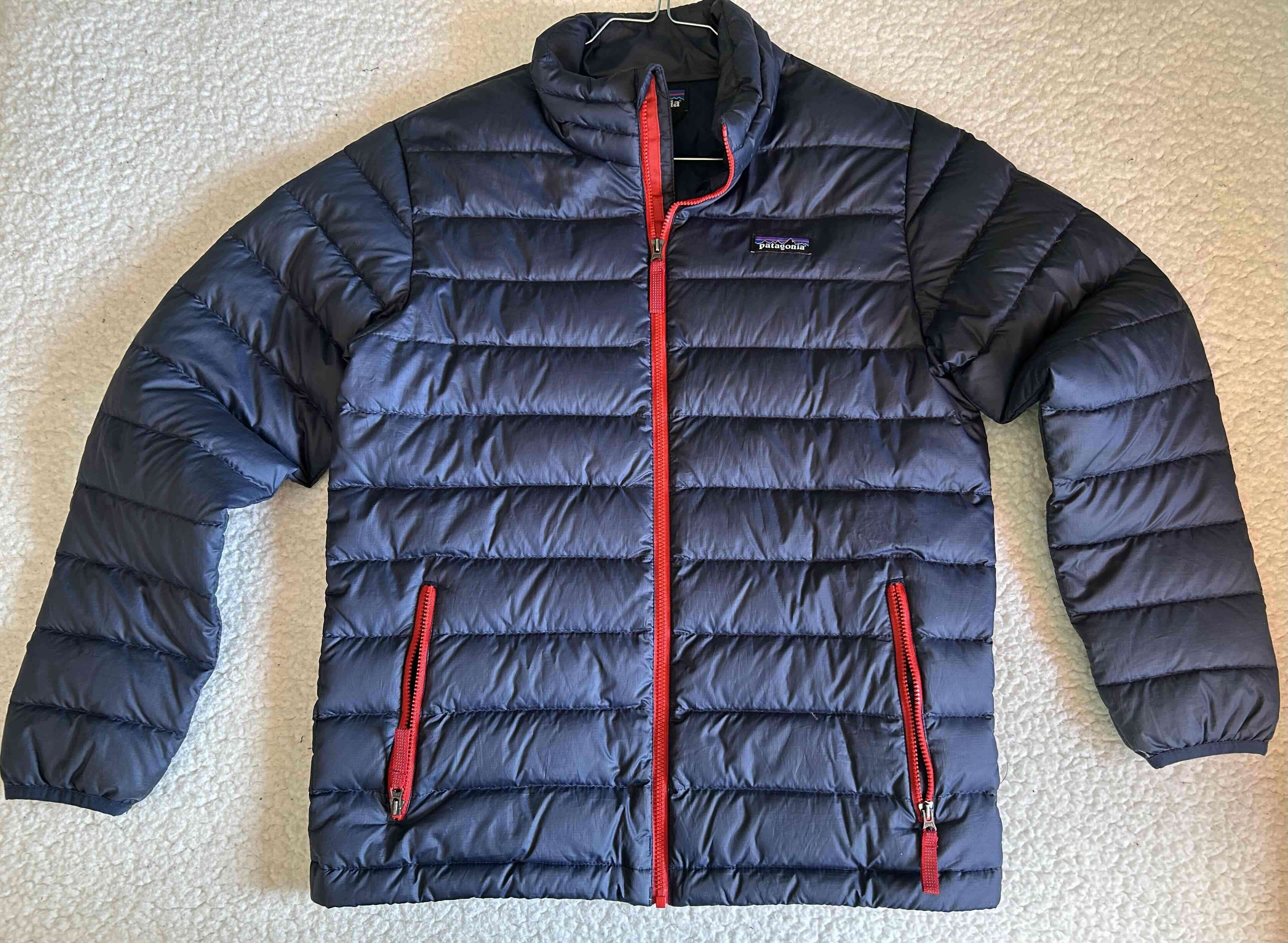 Abrigo ligero de pluma en azul oscuro con cremalleras rojas. Ideal para el invierno. Buen estado general. Talla L edad 12 años. Altura 146 cm pecho 72 cm cintura 67 cm caderas 76 cm