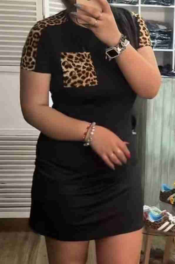 Vestido negro con mangas y bolsillo estampado en leopardo. Ideal para un look casual y moderno. Buen estado general. Polerones talla 16