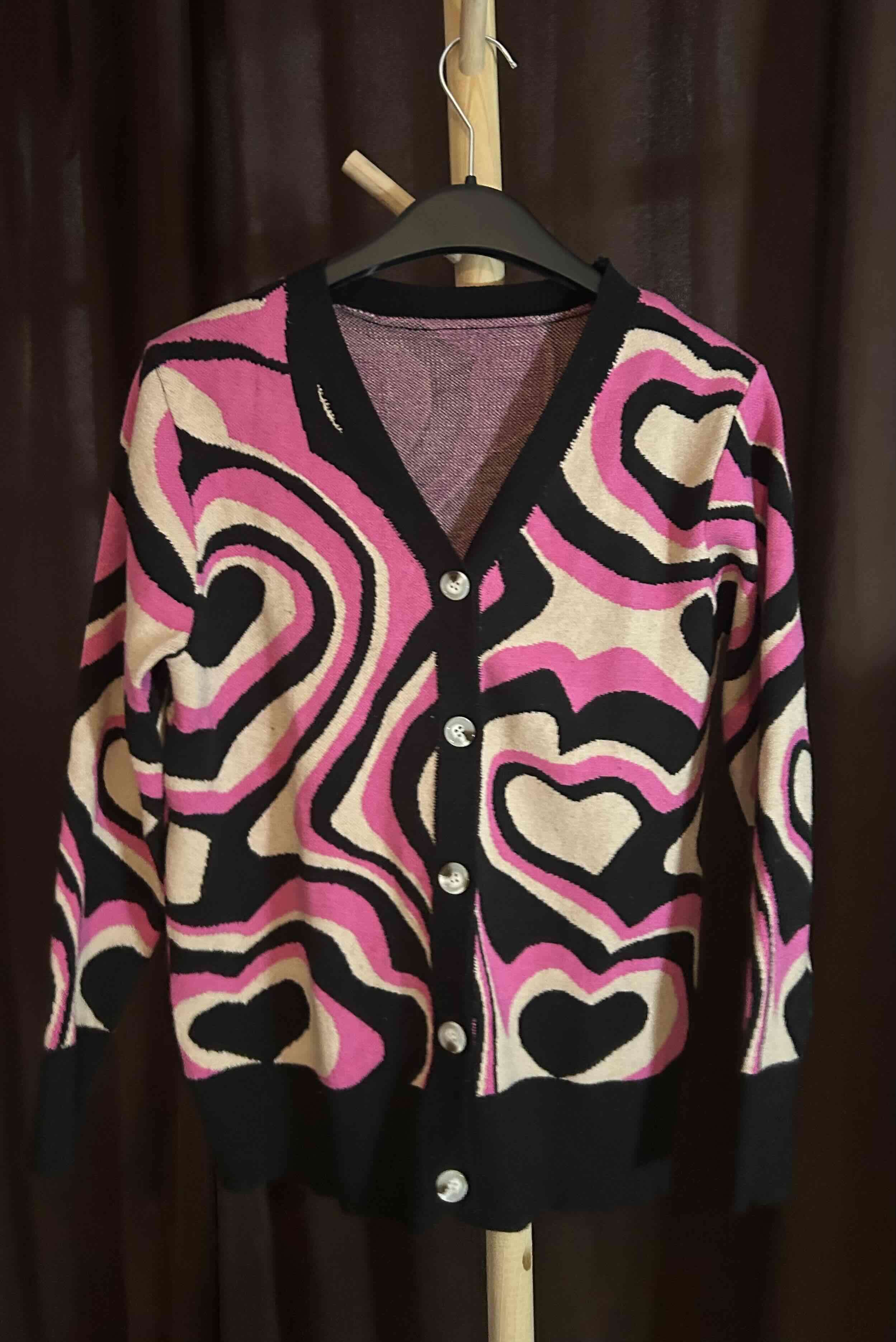 Suéter de mujer con diseño psicodélico en rosa, negro y beige. En buen estado, ideal para un look retro y llamativo.