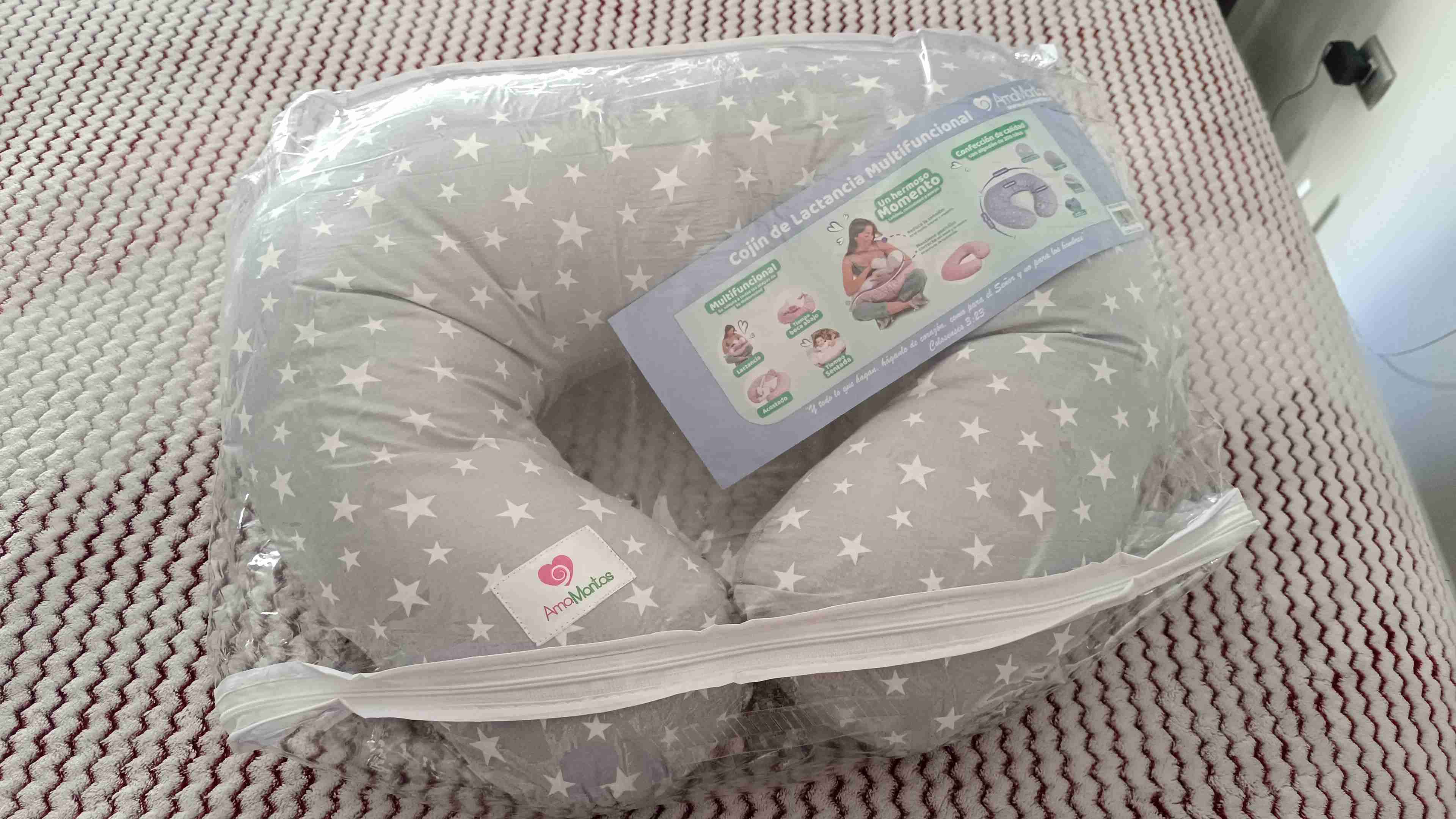 Cojín de lactancia gris con diseño de estrellas, ideal para comodidad durante la alimentación del bebé. Nuevo en empaque original.