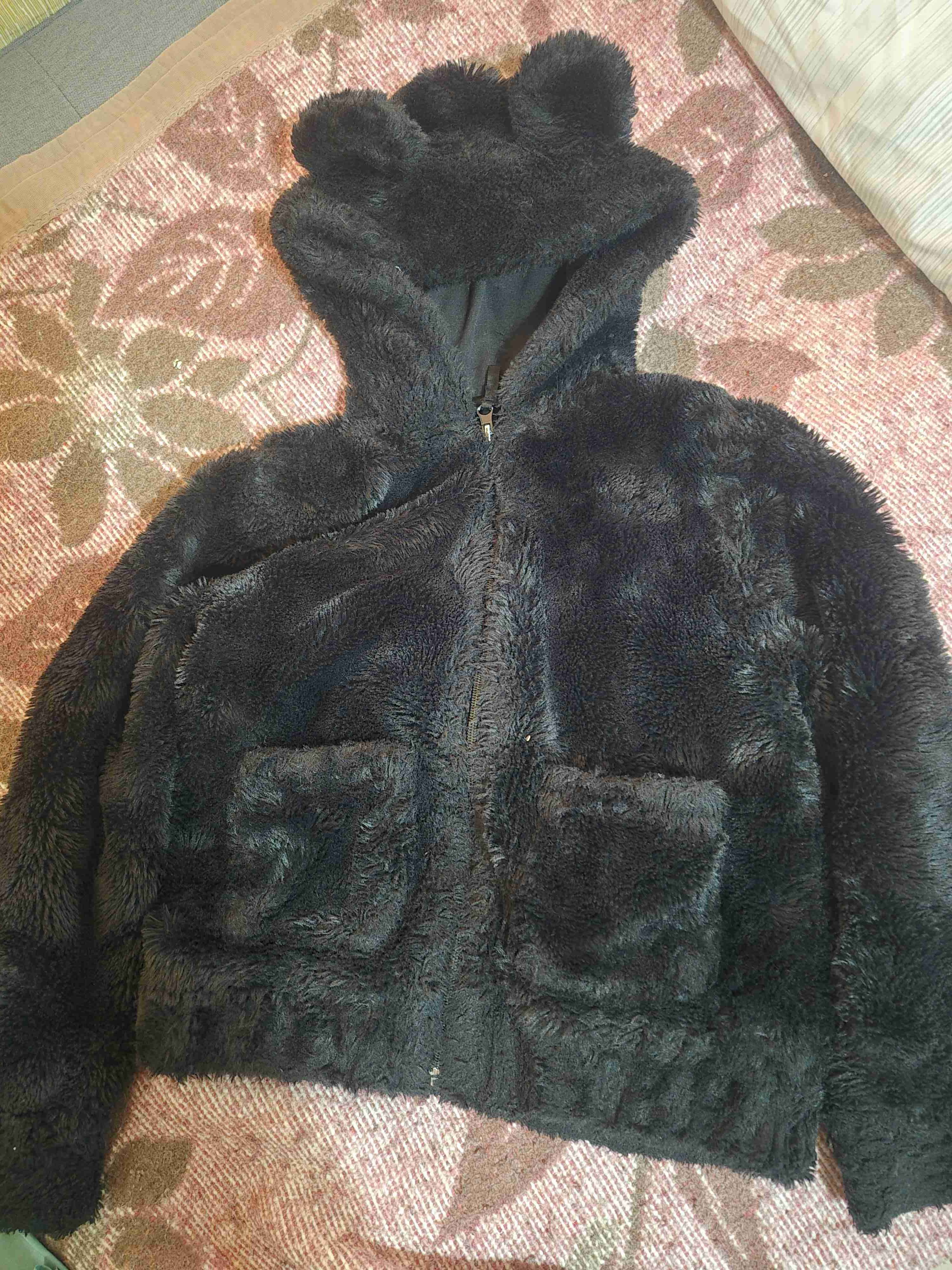 Chaqueta de felpa negra con diseño de orejas en la capucha. Ideal para días fríos, en buena condición y estilo llamativo.